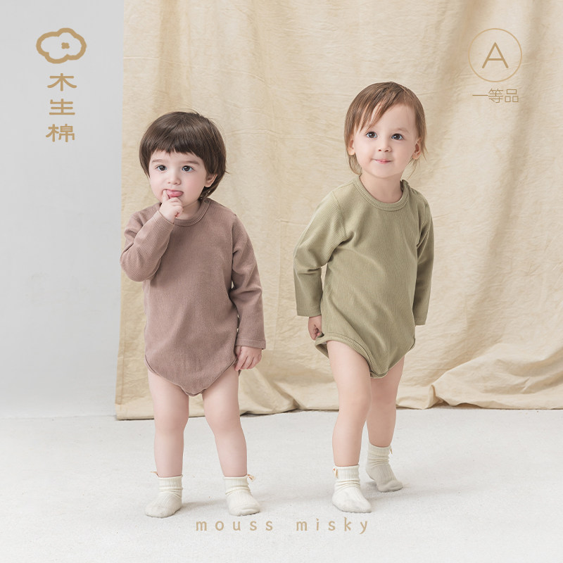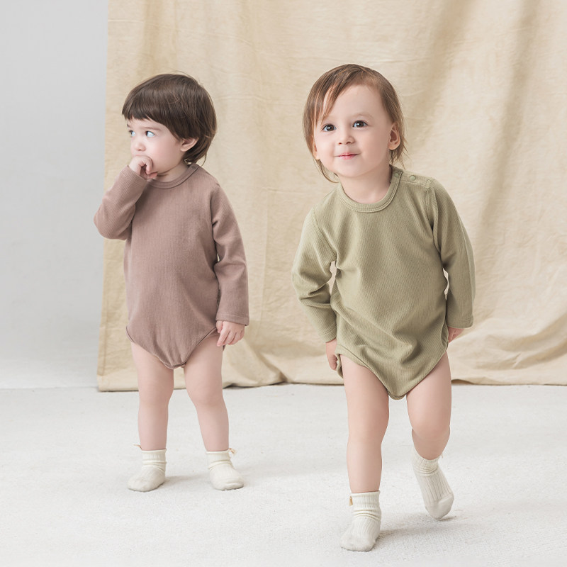木生棉婴幼儿长袖包屁衣春秋季宝宝弹力三角哈衣爬服坑条保暖秋装