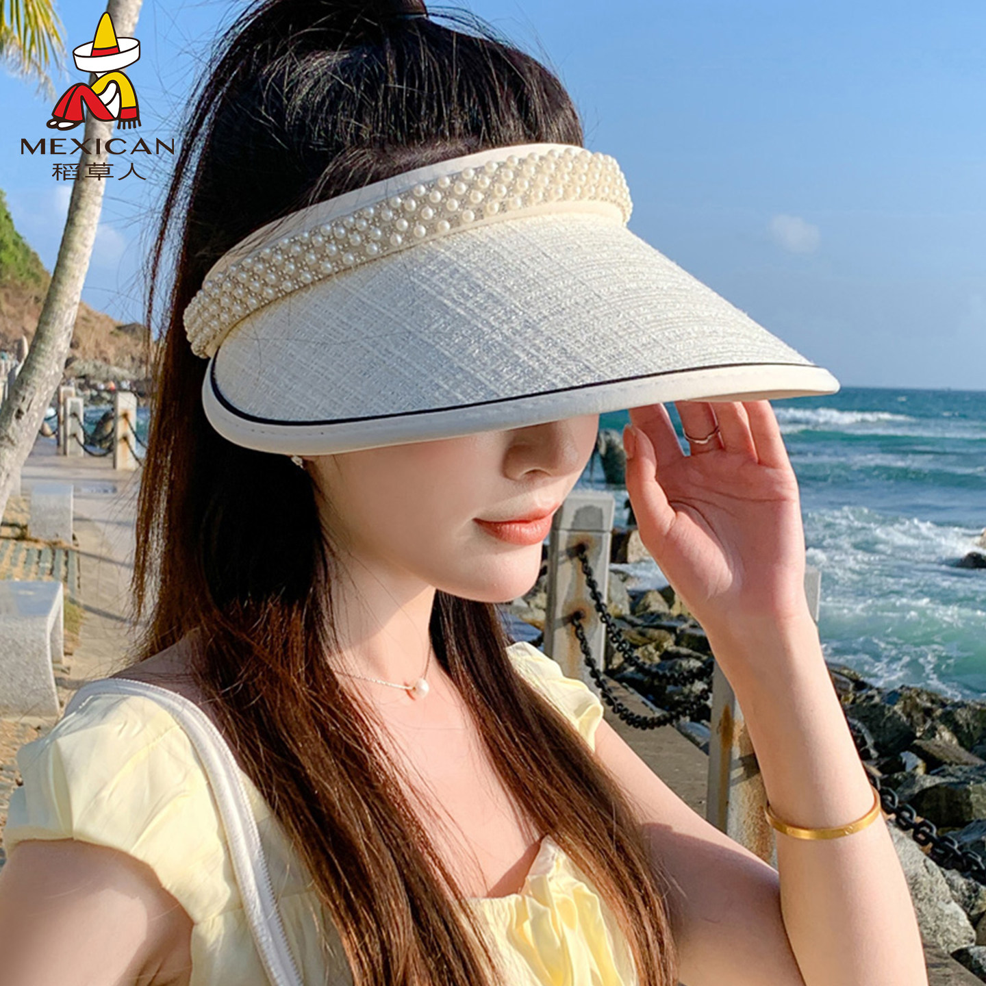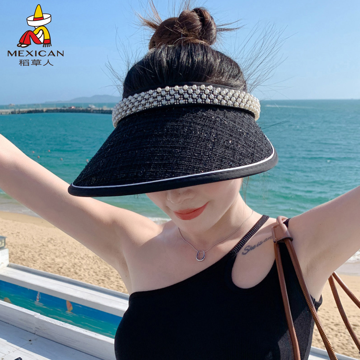 稻草人草帽女夏珍珠帽发箍空顶草编发卡户外遮脸遮阳防晒太阳帽子