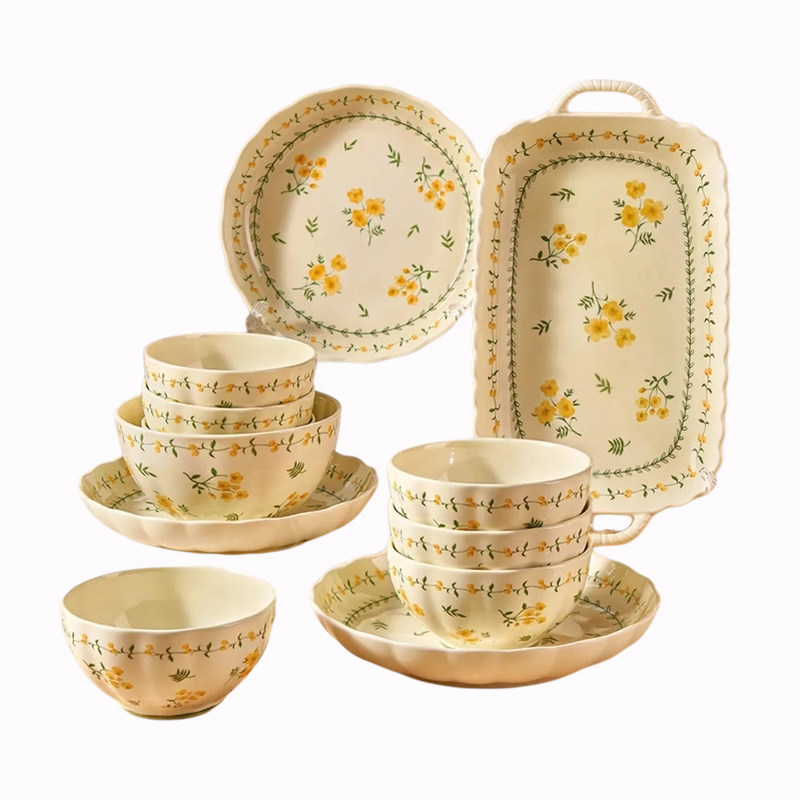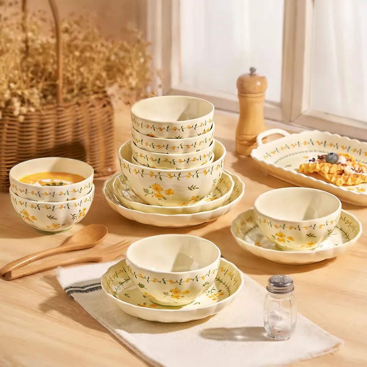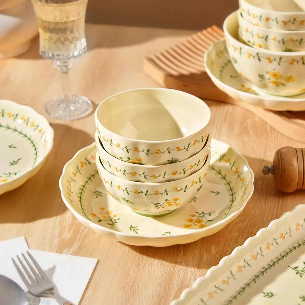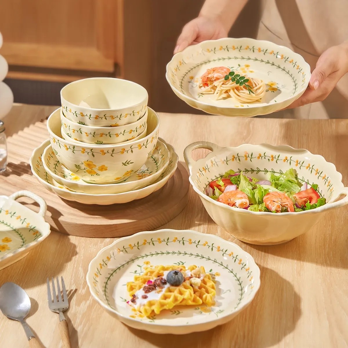 奶油风陶瓷碗家用卡通菜盘子可爱米饭碗汤碗釉下彩儿童餐具耐高温