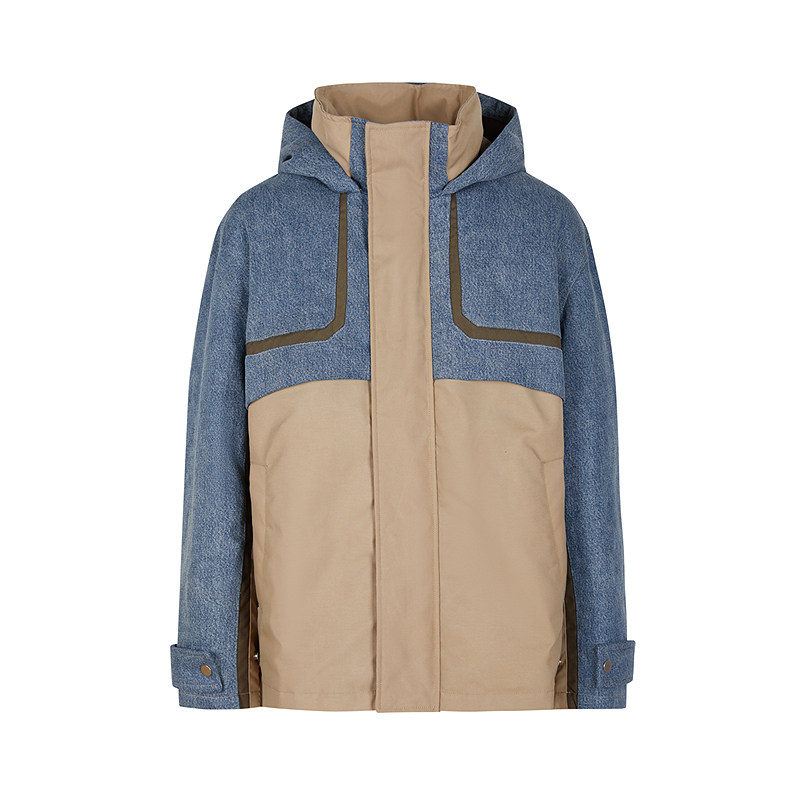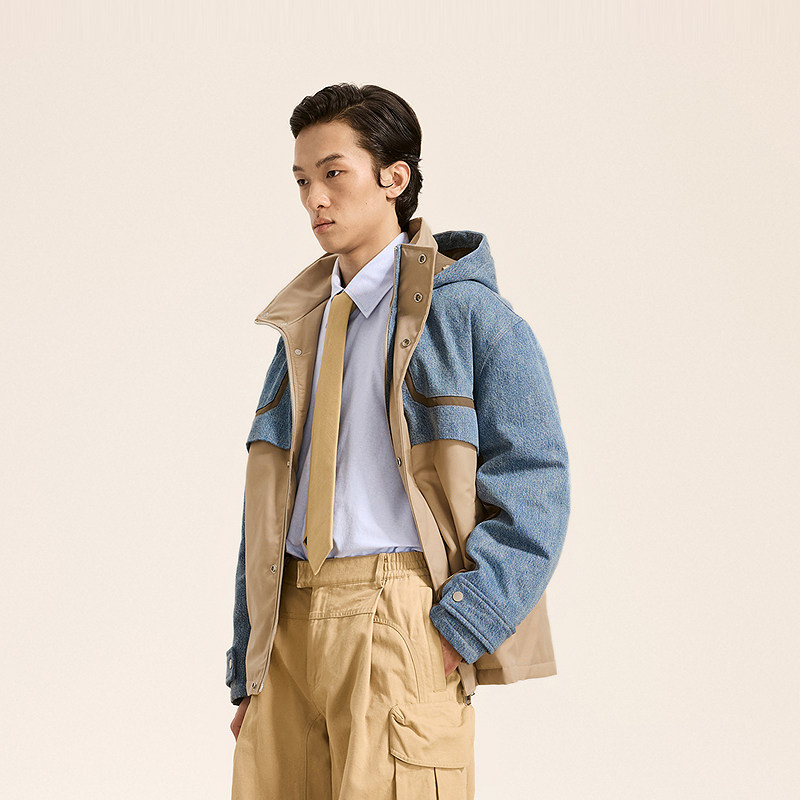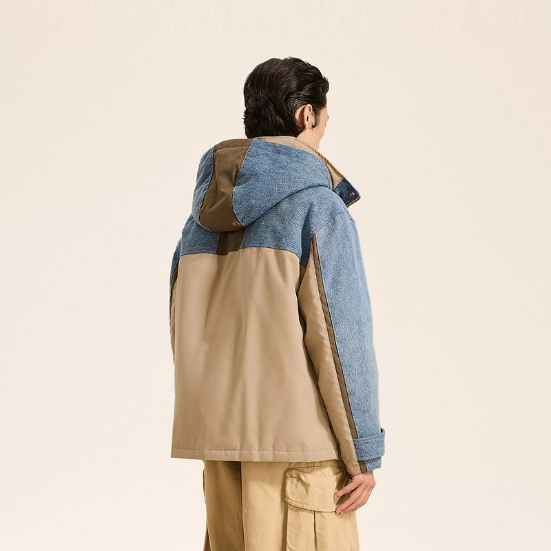 速写男装秋冬新款男士羽绒服长款牛仔拼接户外感连帽羽绒服休闲
