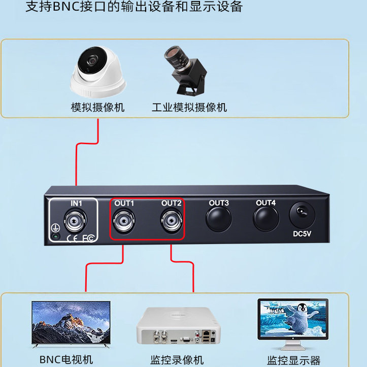 监控摄像机一进二出BNC视频分配器模拟信号1入二出分支放大300米