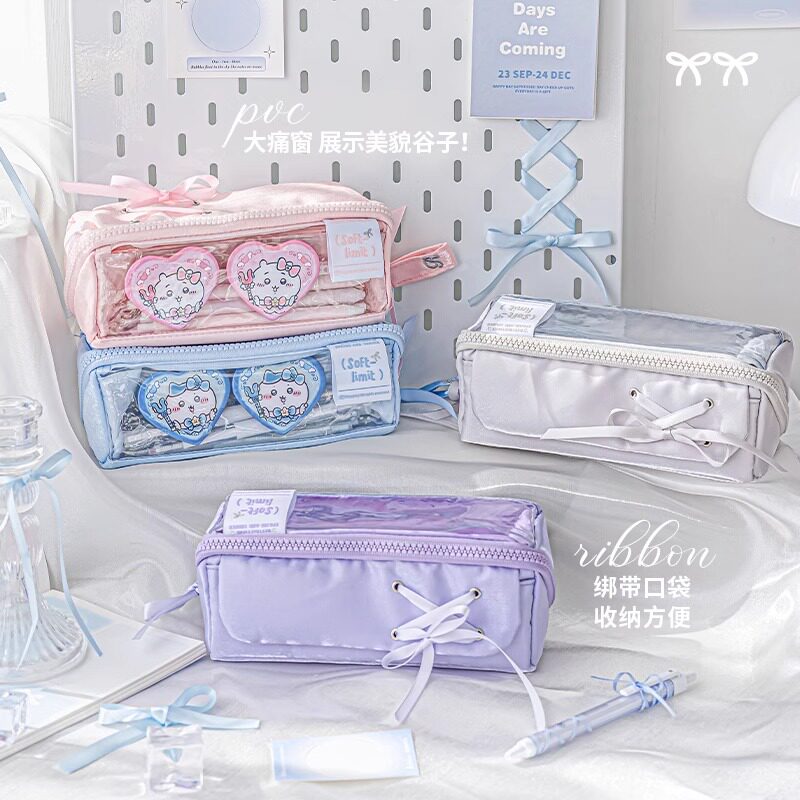 RosyPosy柔设芭蕾丝带痛包笔袋大容量透明夹层文具蓝色笔盒高颜值二次元ins风初中女生ins蕾丝吧唧装饰小食量