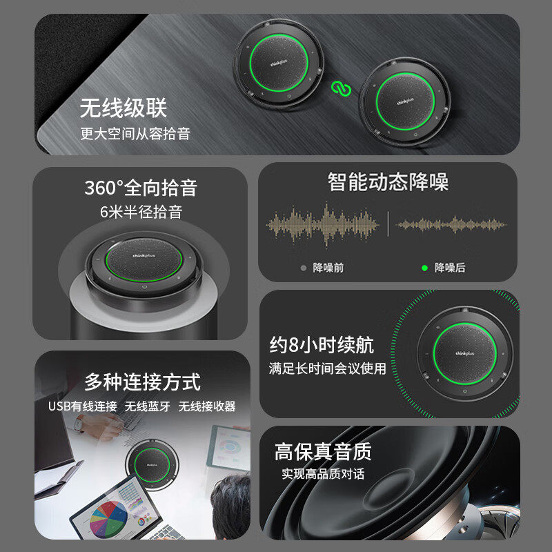 联想thinkplus视频会议全向麦克风会议麦克风拾音器扬声器音箱USB无线蓝牙连接智能降噪8i小时续航MK-MC800+
