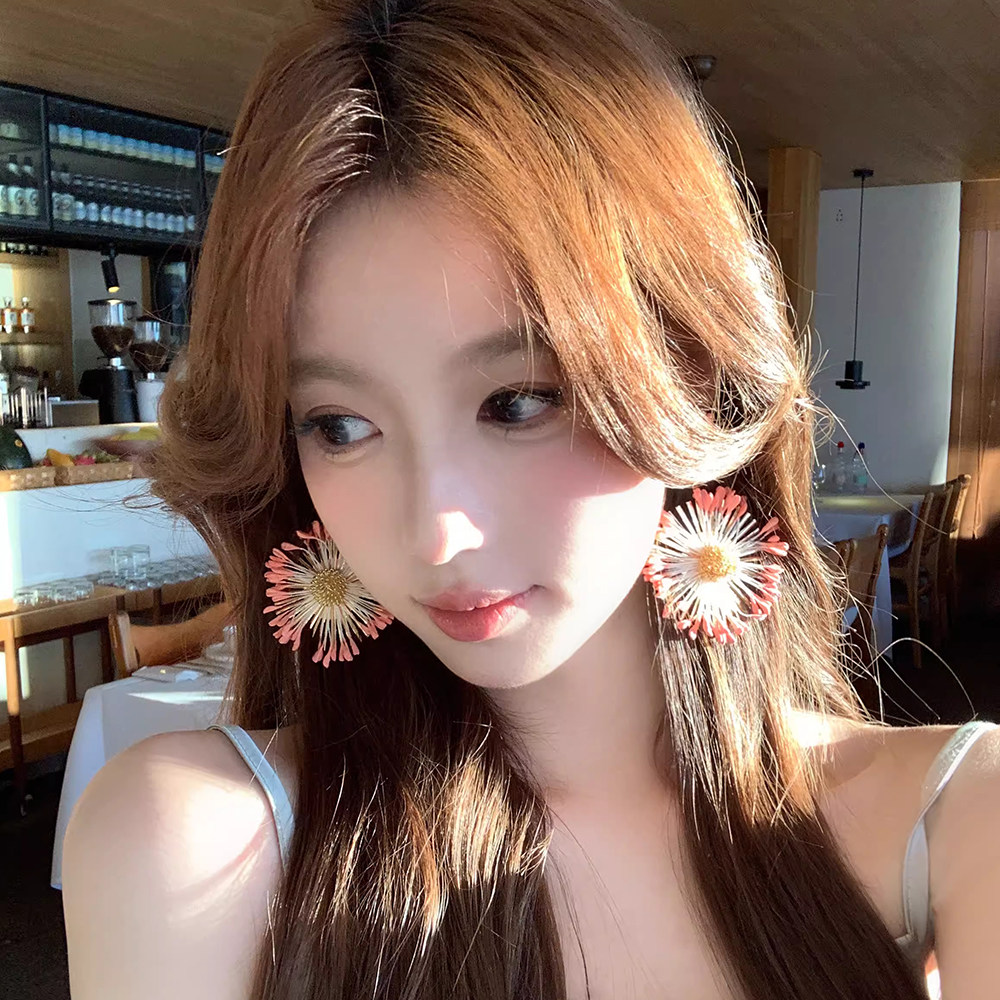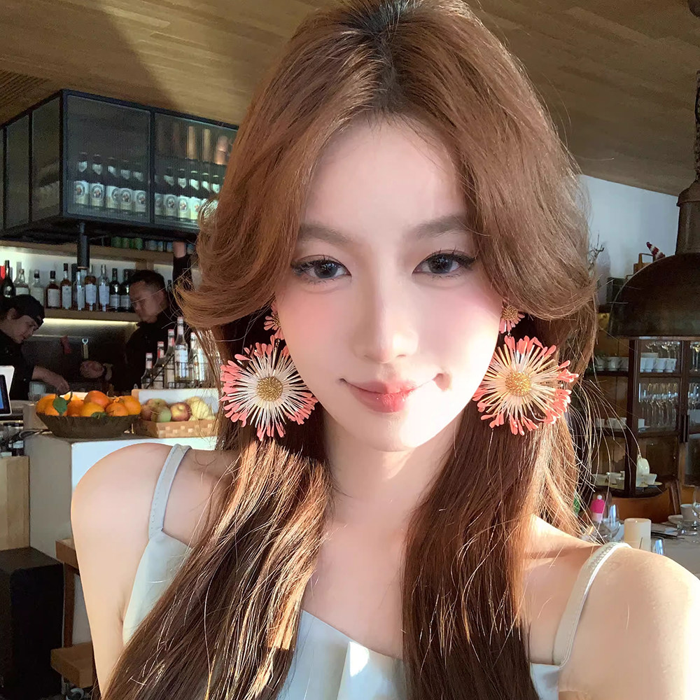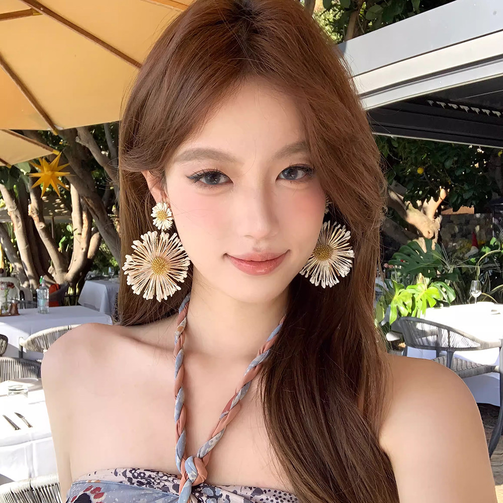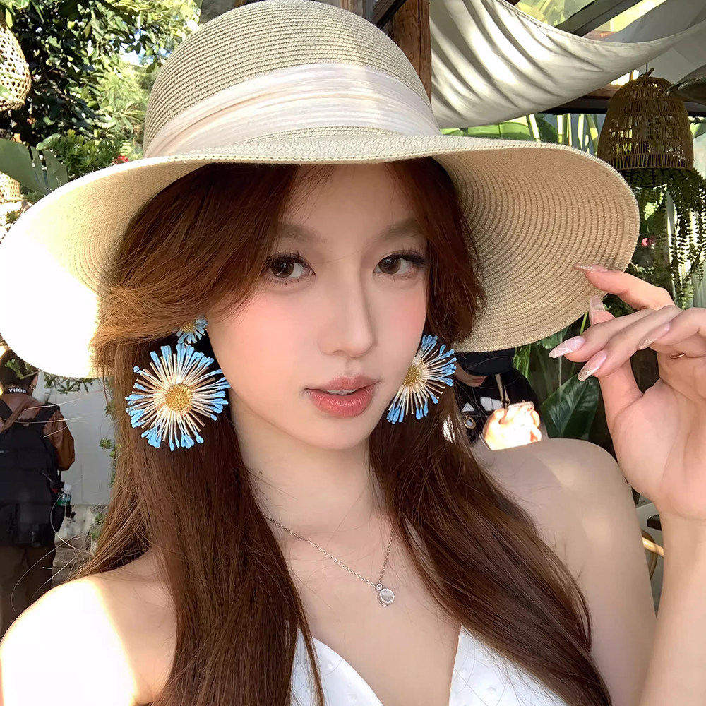 波西米亚草编太阳花耳环夏季度假风夸张耳钉旅游拍照耳饰蓝色紫色