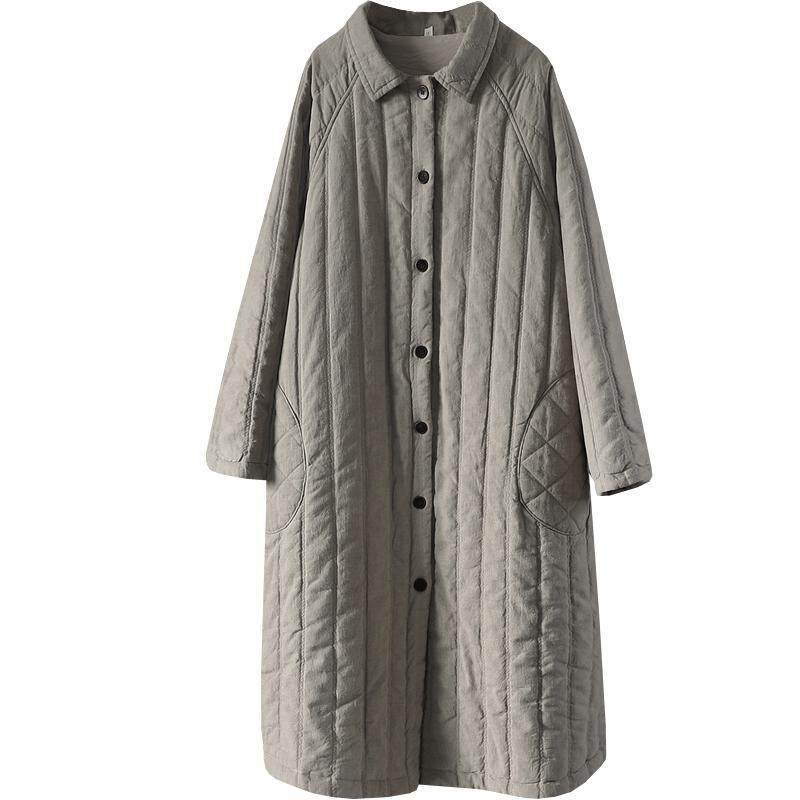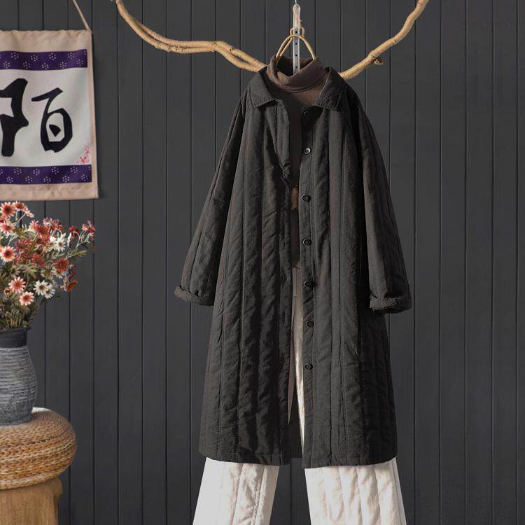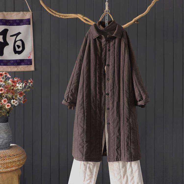 复古做旧夹棉加厚苎麻外套女宽松纯色插肩袖翻领过膝长款棉衣棉服