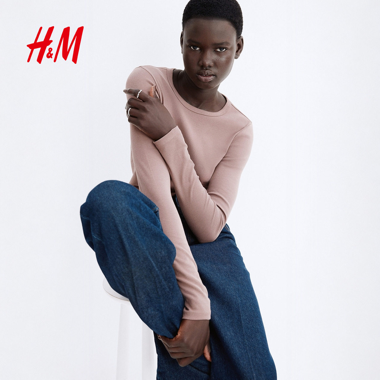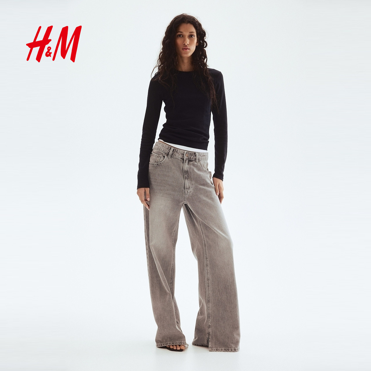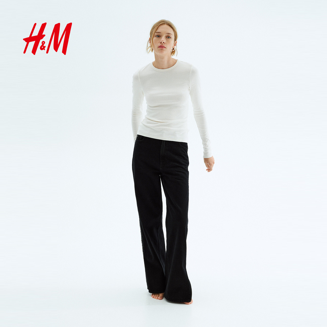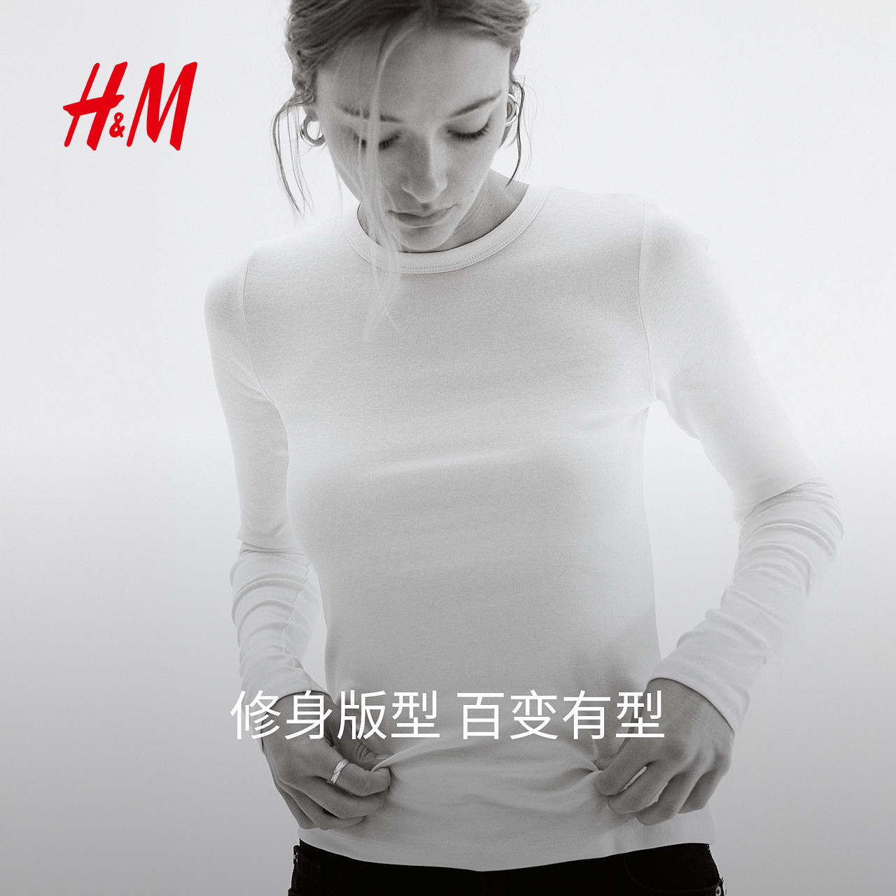 HM女装T恤25春季修身显瘦时尚休闲洋气圆领长袖内搭打底衫1254718
