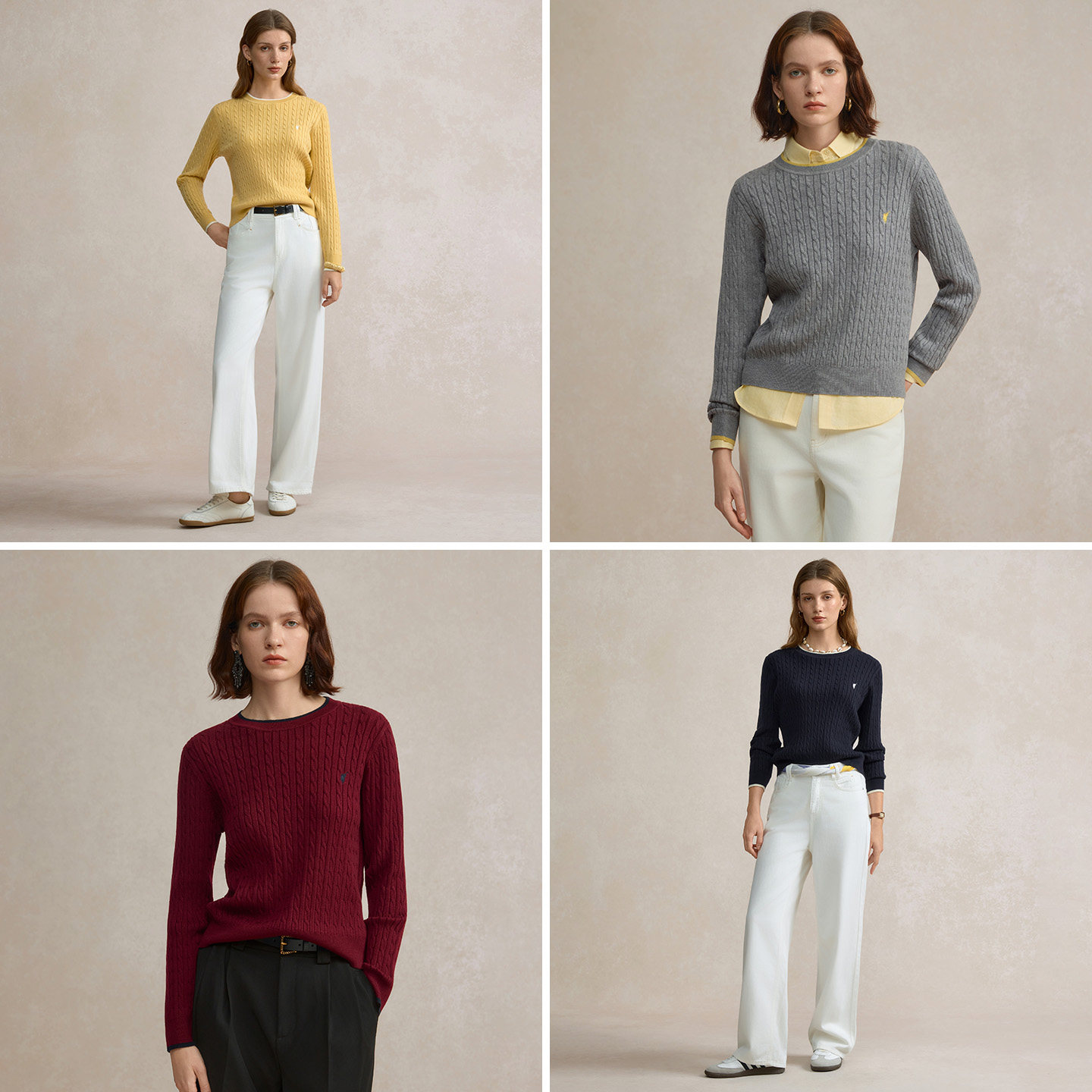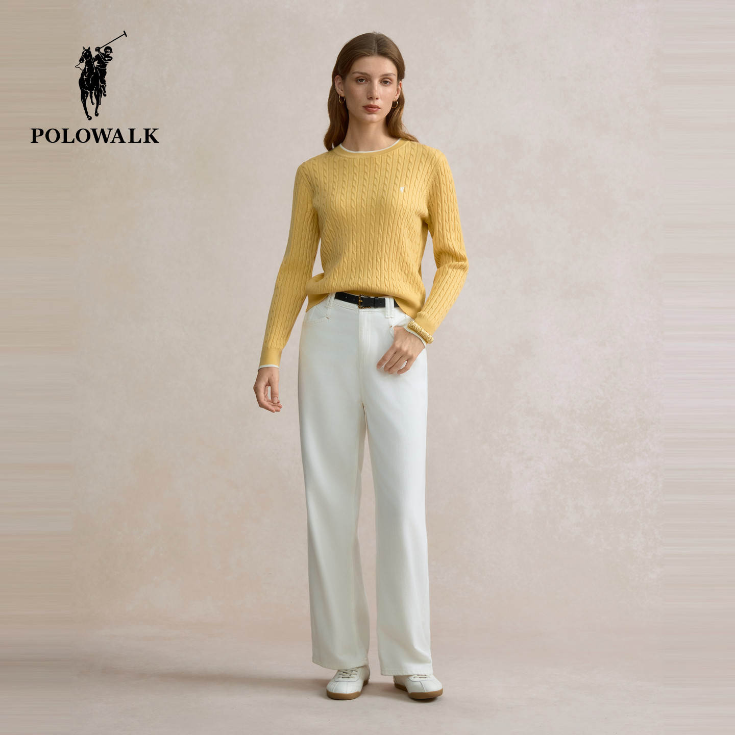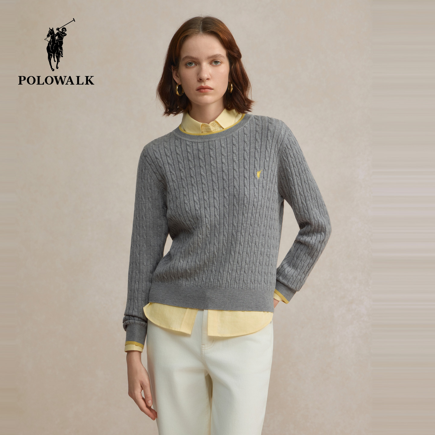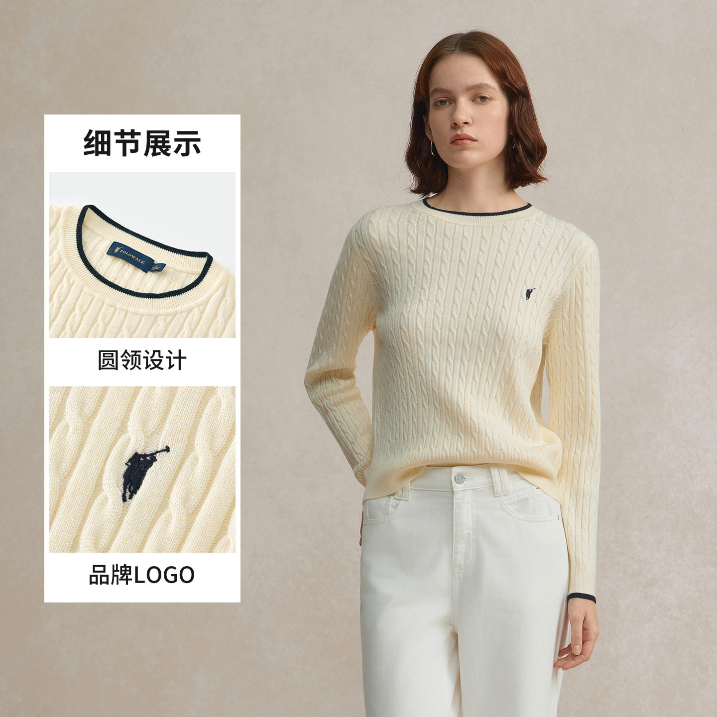 POLOWALK女毛衣绞花长袖针织衫2026春季新款撞色圆领绞花毛衣女装
