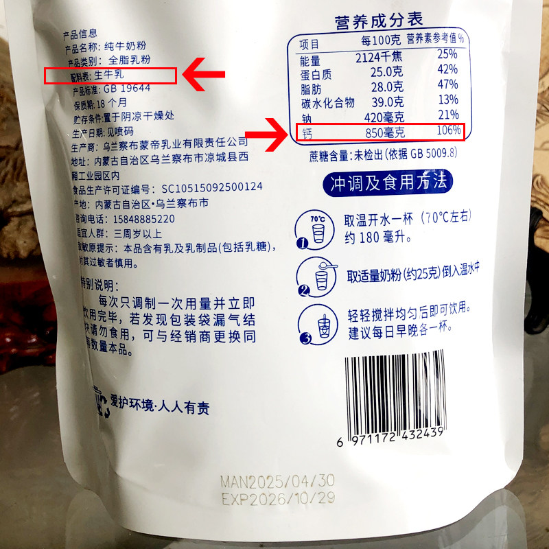 纯牛奶粉500g草原额吉袋装烘焙成人女士孕妇学生青少年中老年奶粉