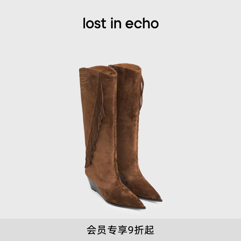 王艺瑾同款lost in echo2025冬季新款波西米亚尖头流苏坡跟长筒靴