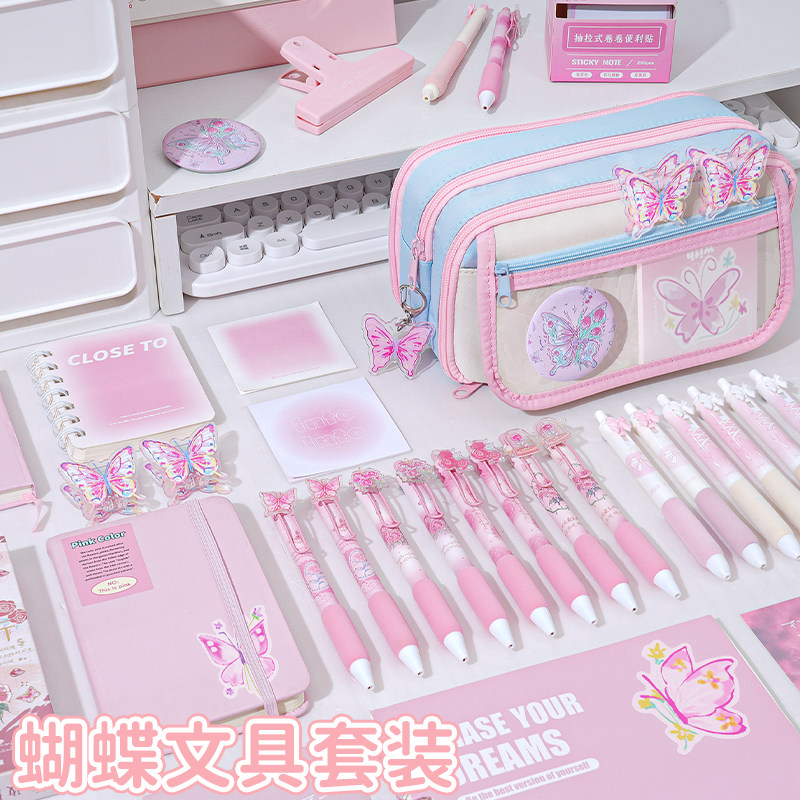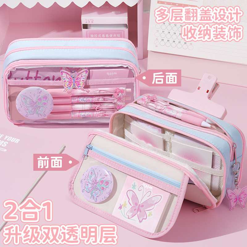 13层粉蓝蝴蝶~大容量撞色笔袋女生2025新款超火高颜值ins风文具盒女孩款小学生透明铅笔盒初中生不撞款文具袋