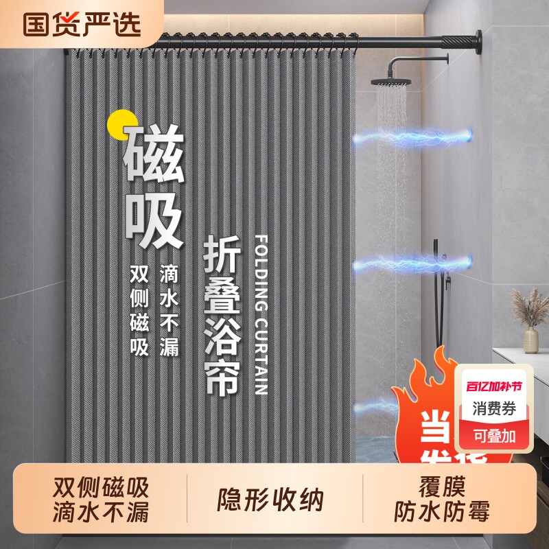 双吸盘折叠浴帘浴室防水隐形卫生间窗帘洗澡淋浴高档干湿分离隔断