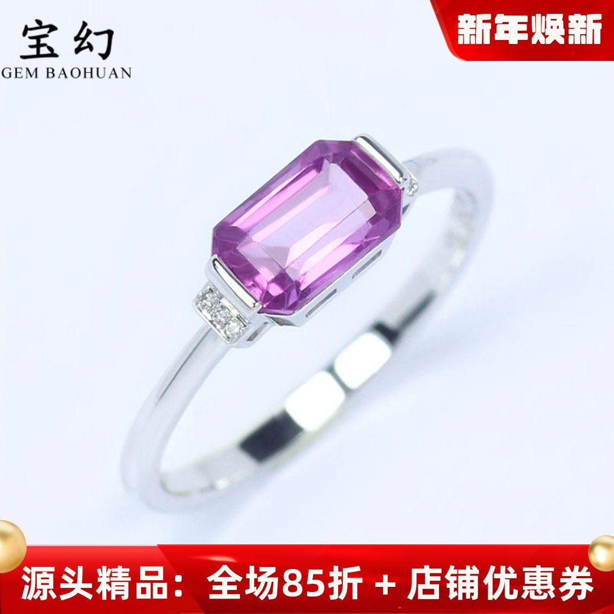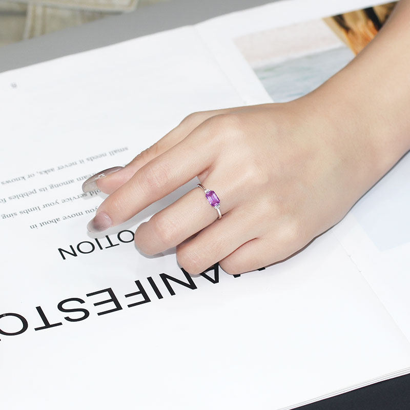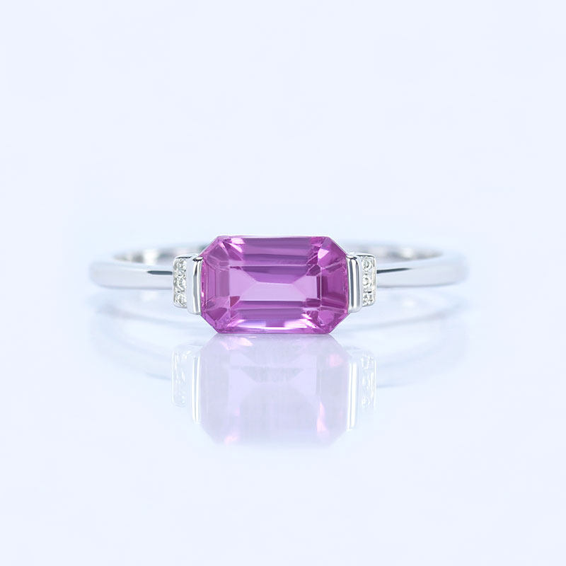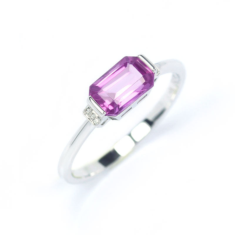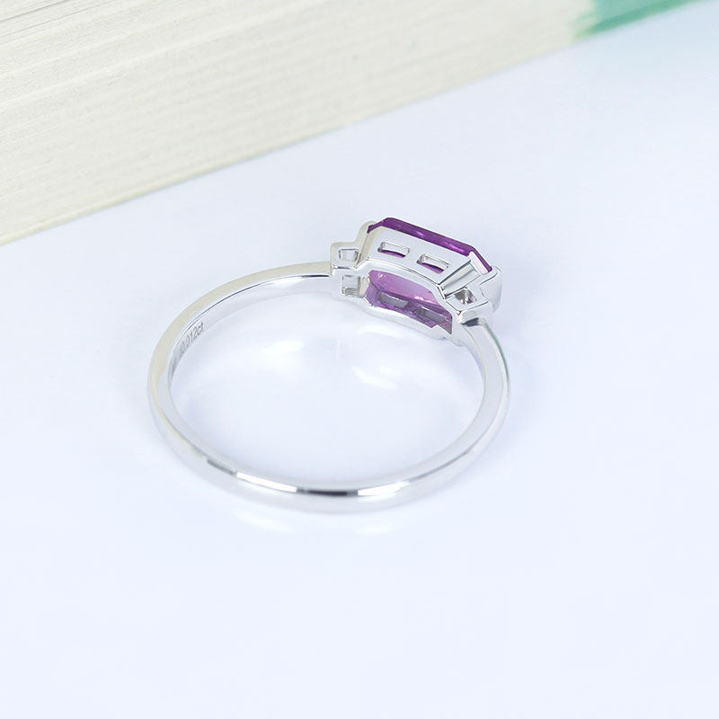 G18K白金无烧粉紫色蓝宝石长方形戒指 1克拉镶钻石复古尾戒女款