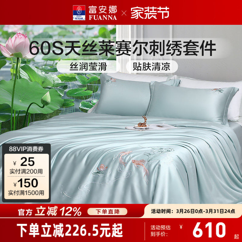 富安娜60支天丝四件套凉感床单冰丝被套轻奢高级感绣花床上套件