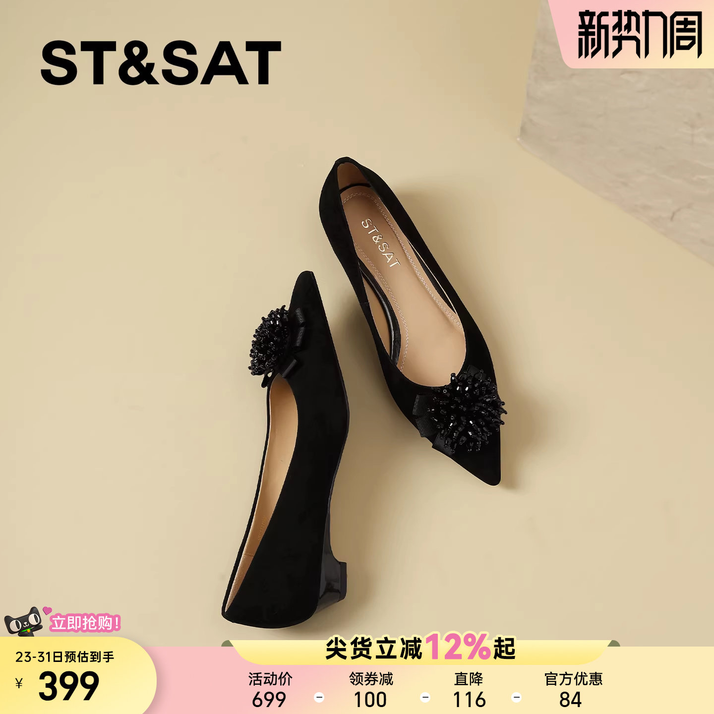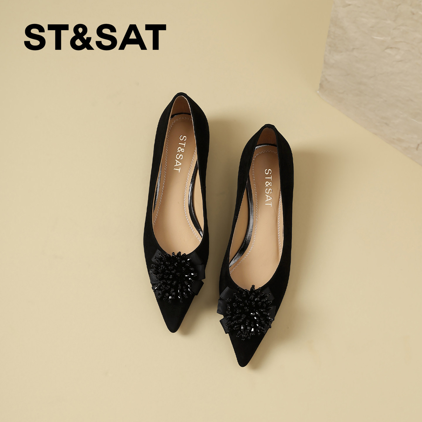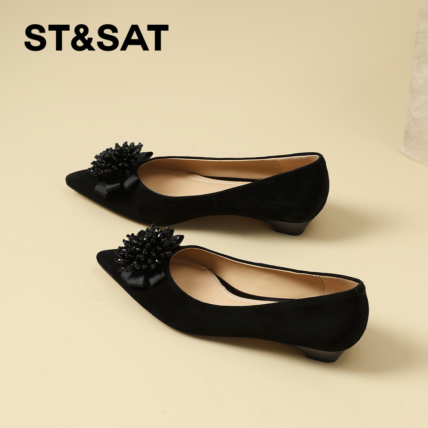 星期六优雅真皮尖头浅口单鞋女2026春季新款水晶花饰低跟通勤鞋