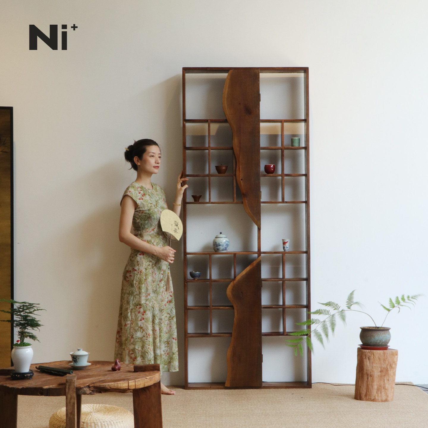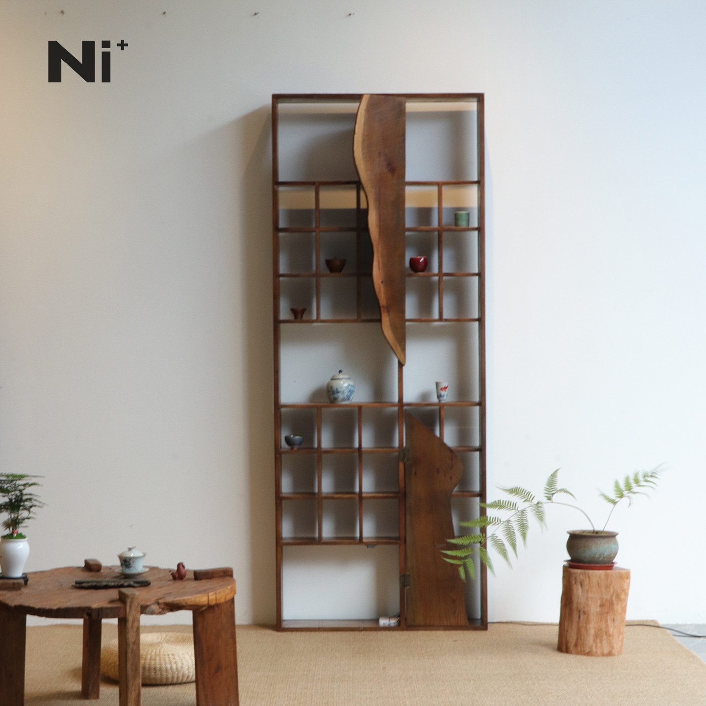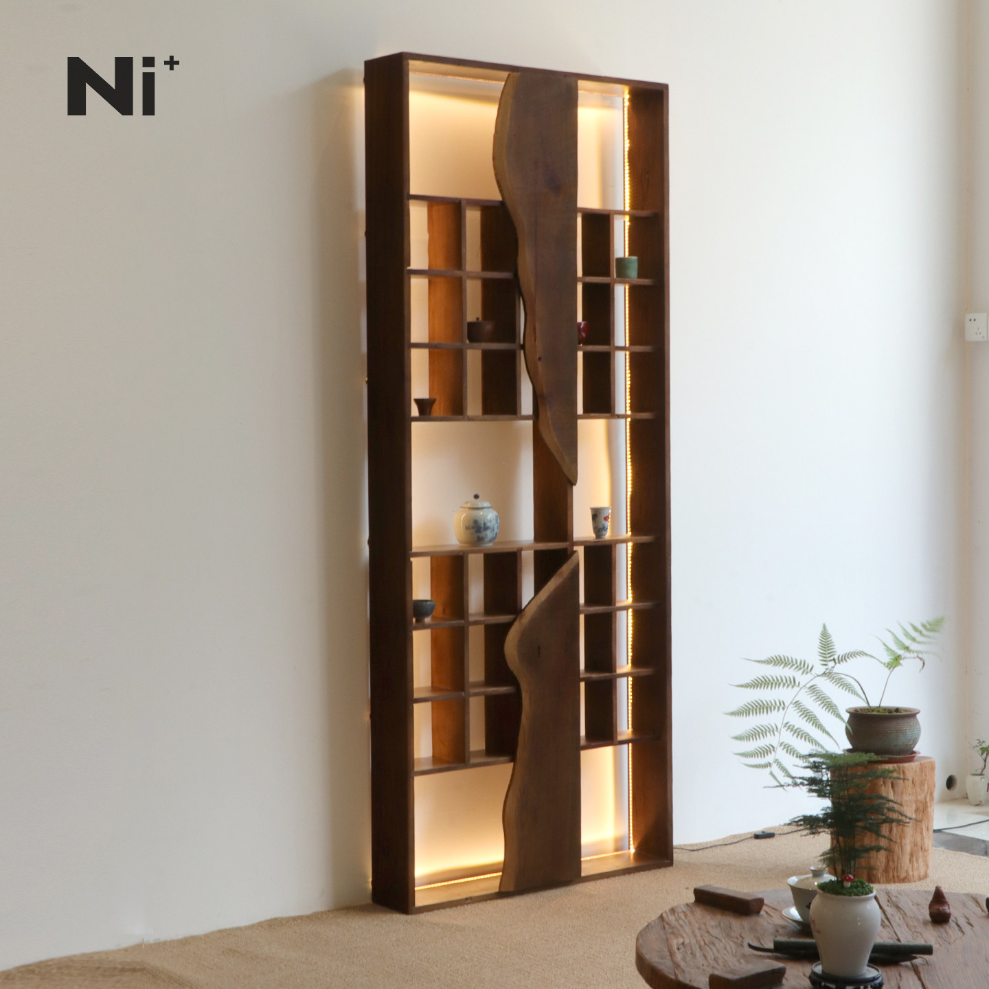 Ni尼家侘寂风博古架实木中式茶室茶杯架带灯挂墙收纳架茶具展示架