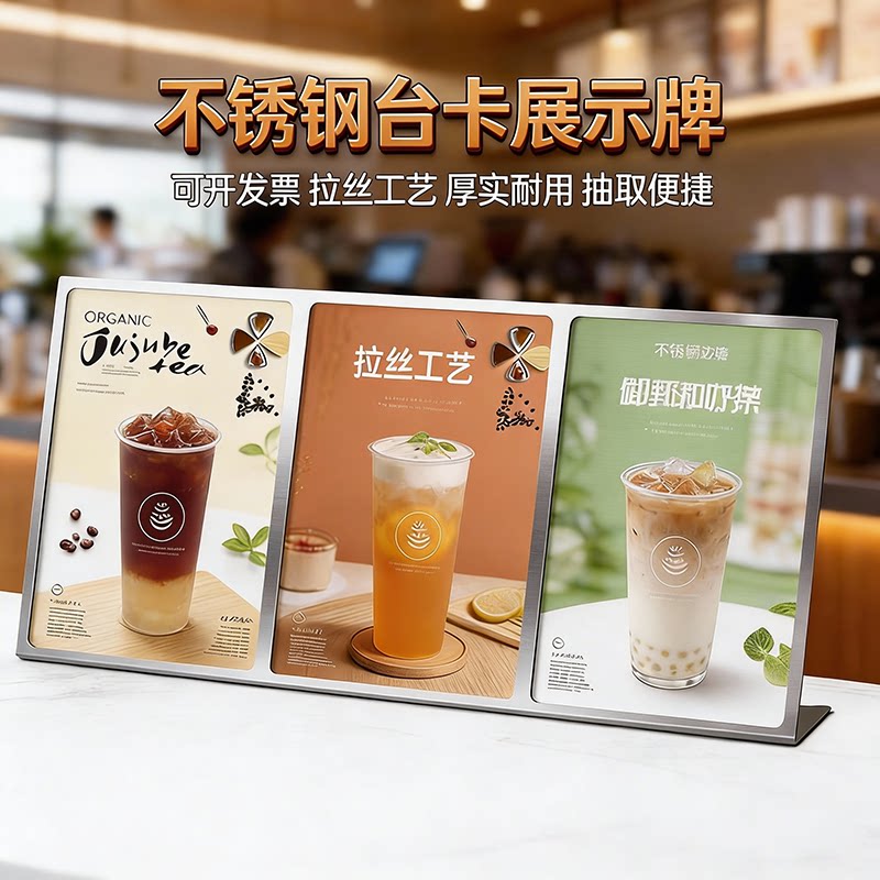 A4不锈钢台卡展示牌奶茶店桌面立牌a5三联立式菜单广告牌展示架a3