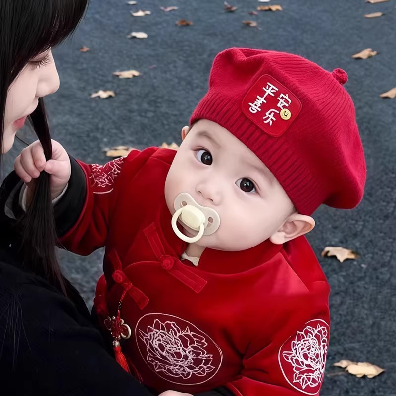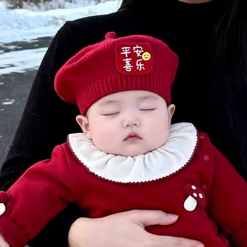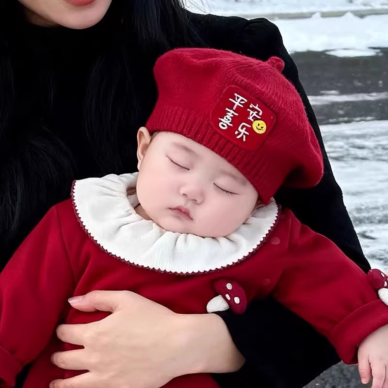 婴幼儿红色宝宝帽子秋冬季男女贝雷帽可爱超萌新年红色毛线帽针织