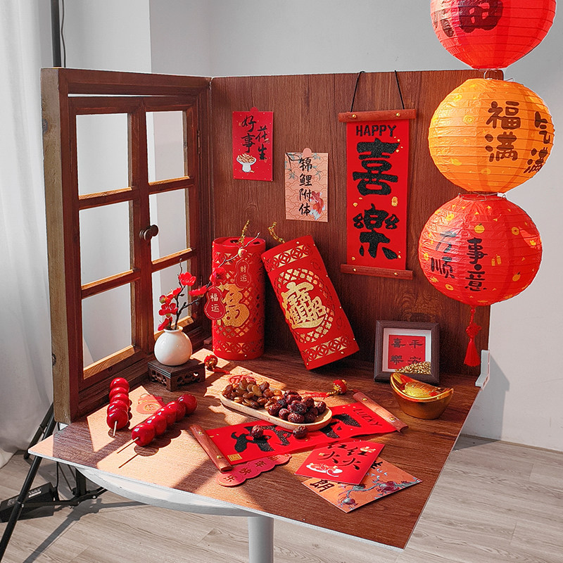 假窗户拍照道具做旧实木直播间场景布置新年氛围造景拍摄背景板
