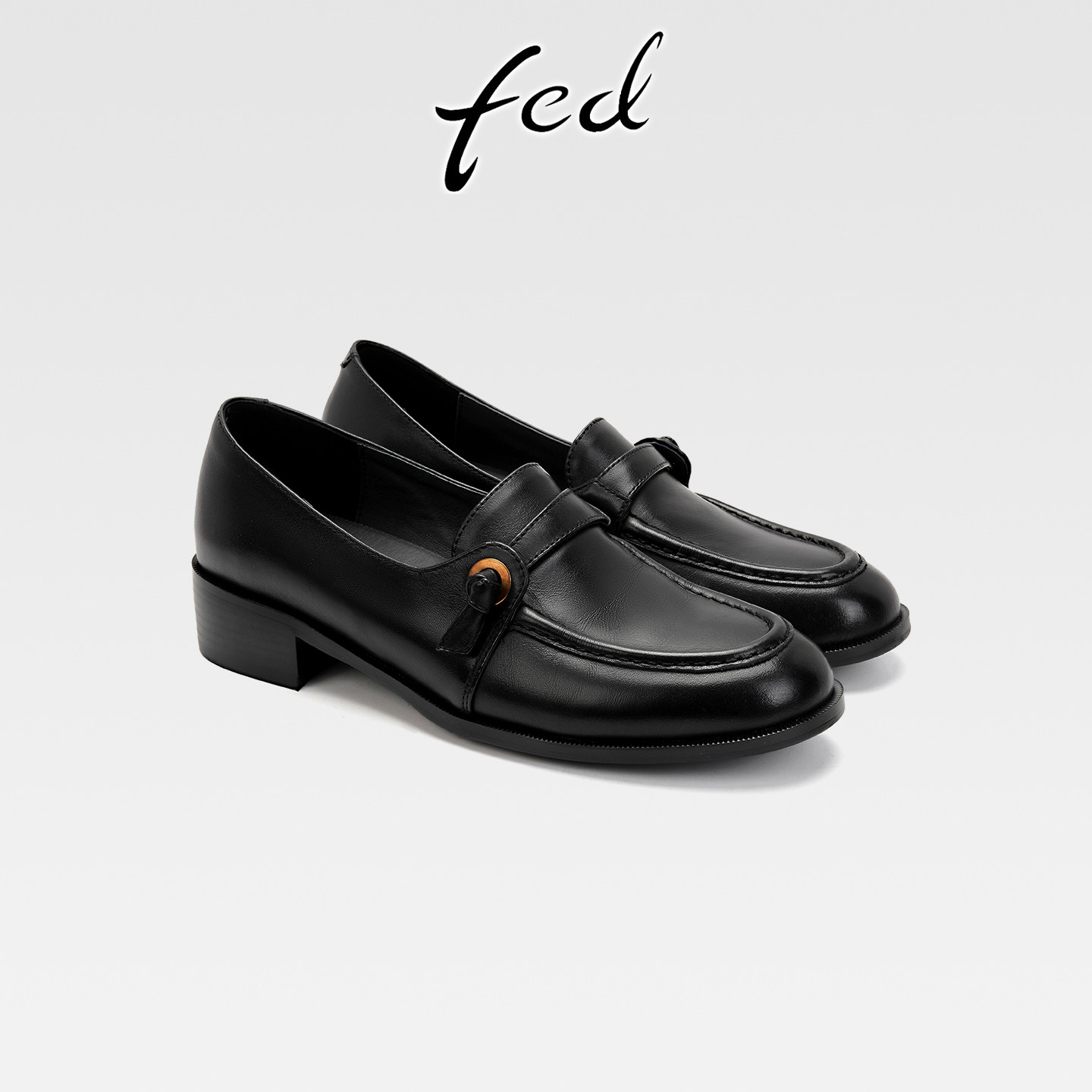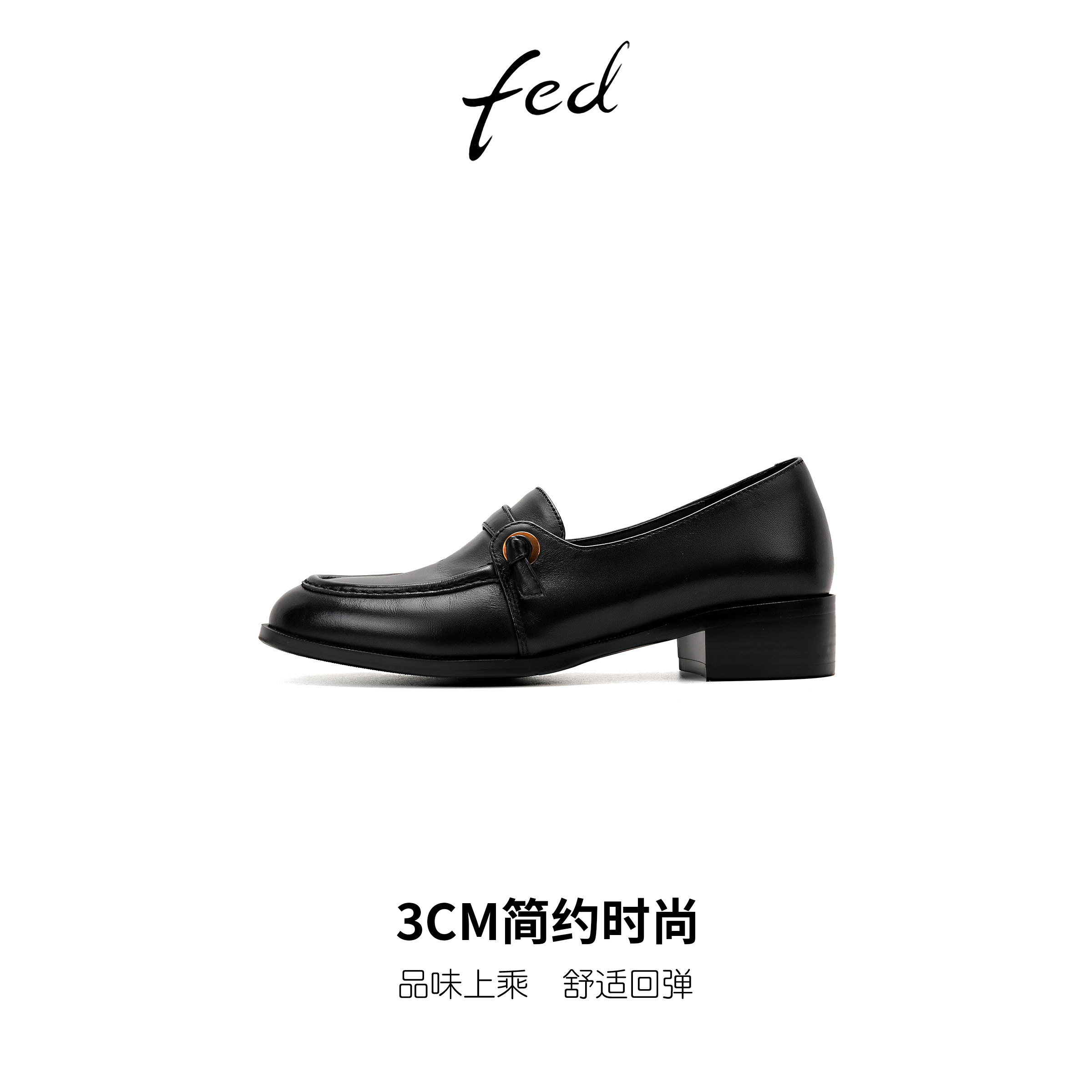fed英伦风软牛皮粗跟乐福鞋女复古黑色小皮鞋一脚蹬圆头深口单鞋