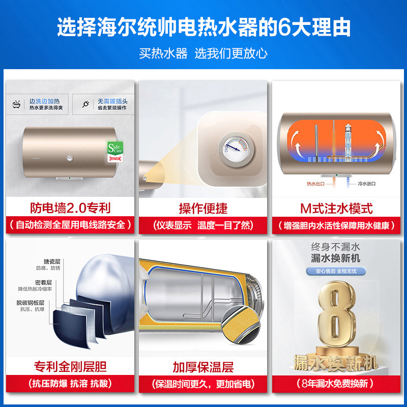 海尔电热水器50升小型40L统帅家用60L卫生间节能速热80储水式洗澡