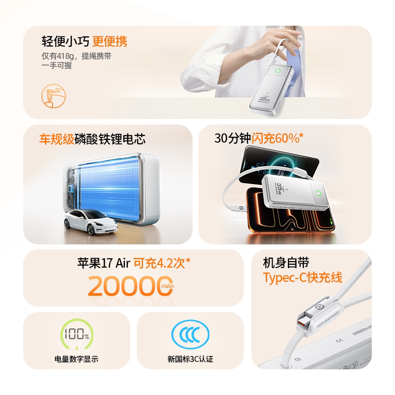 【充电宝3c认证可上飞机】倍思2026新款大容量20000毫安自带线快充移动电源适用小米苹果17专用官方正旗舰店