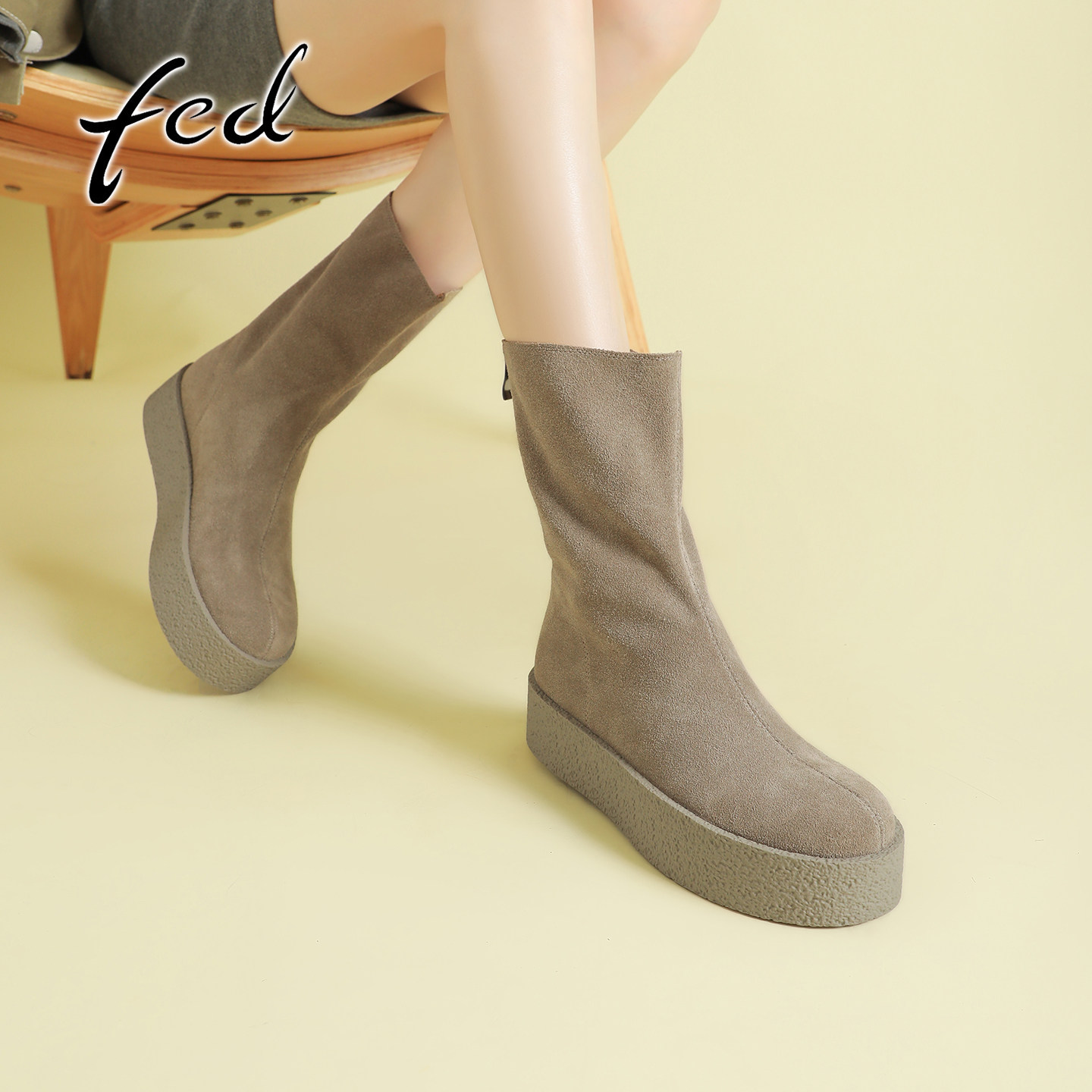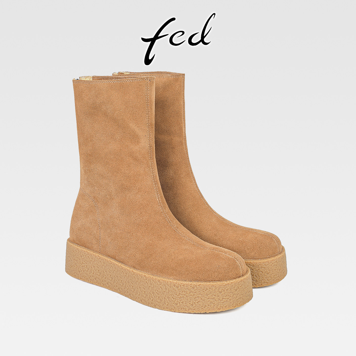 fed小个子增高厚底牛反绒中筒靴女秋冬款后拉链中跟圆头显瘦短靴