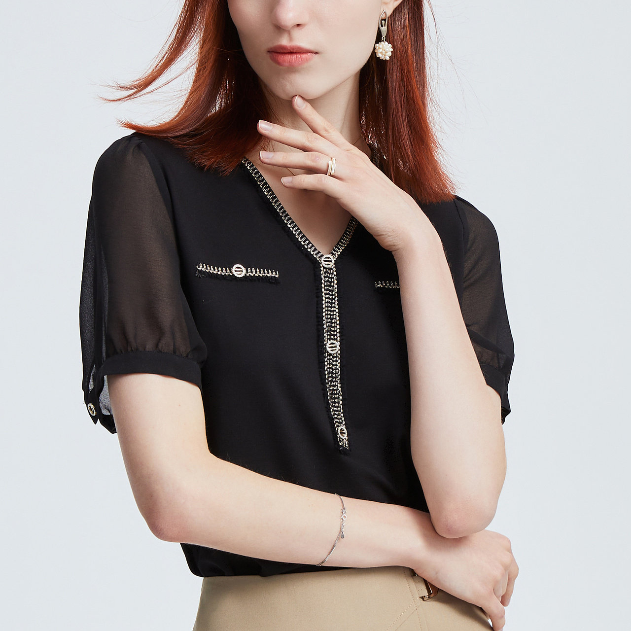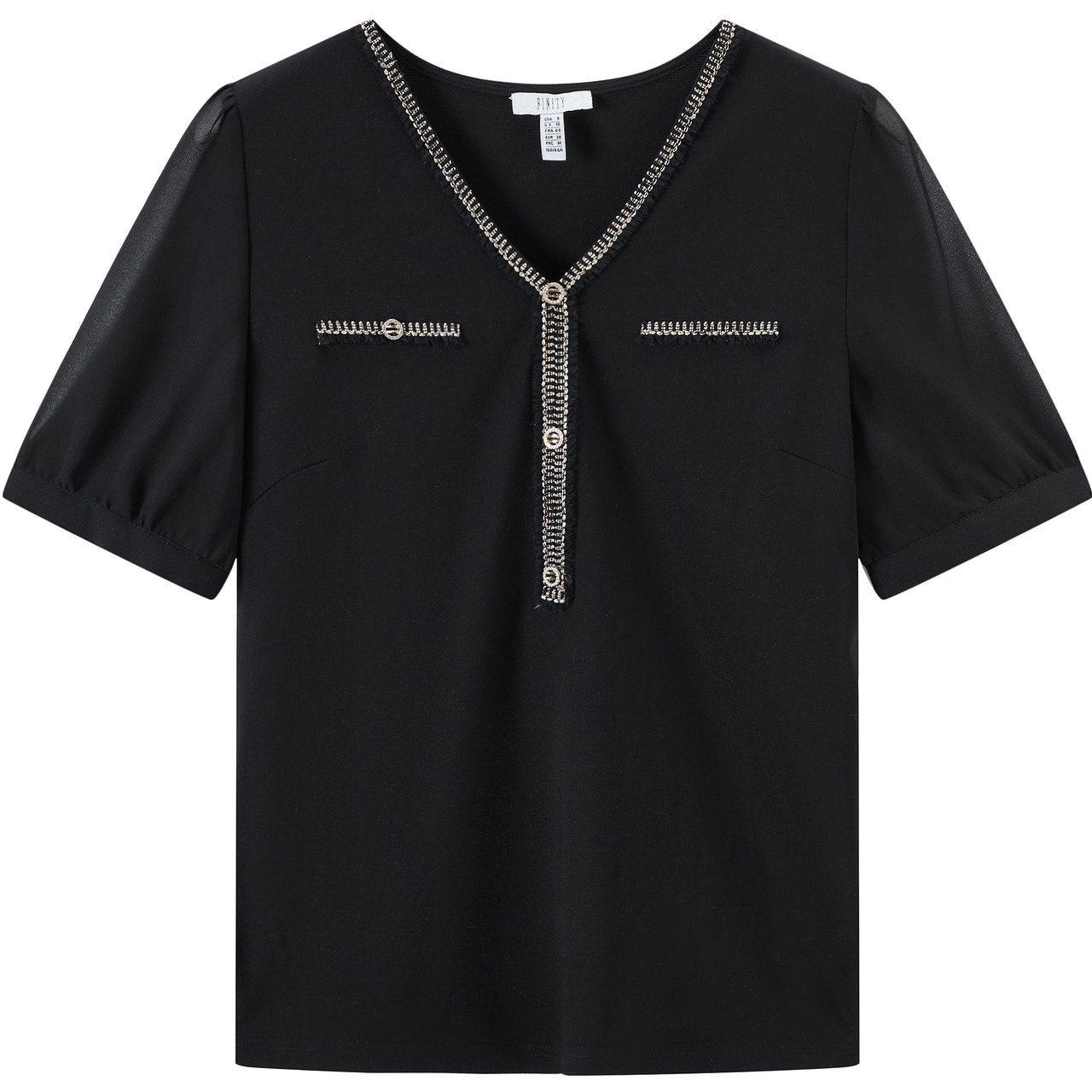 菲妮迪品牌雪纺衫2026年夏季新款 简约小香风V领时尚黑色短袖上衣