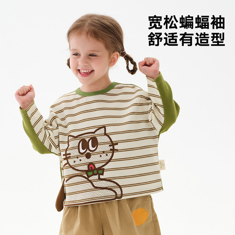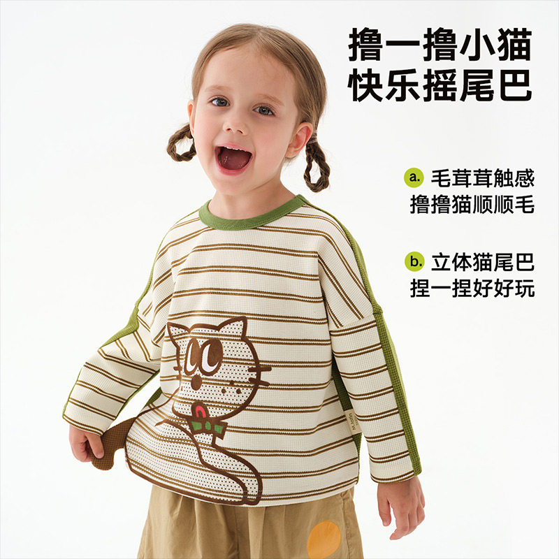 「捏捏小尾巴」马拉丁童装秋新款大小童亲子植绒云感华夫格T恤