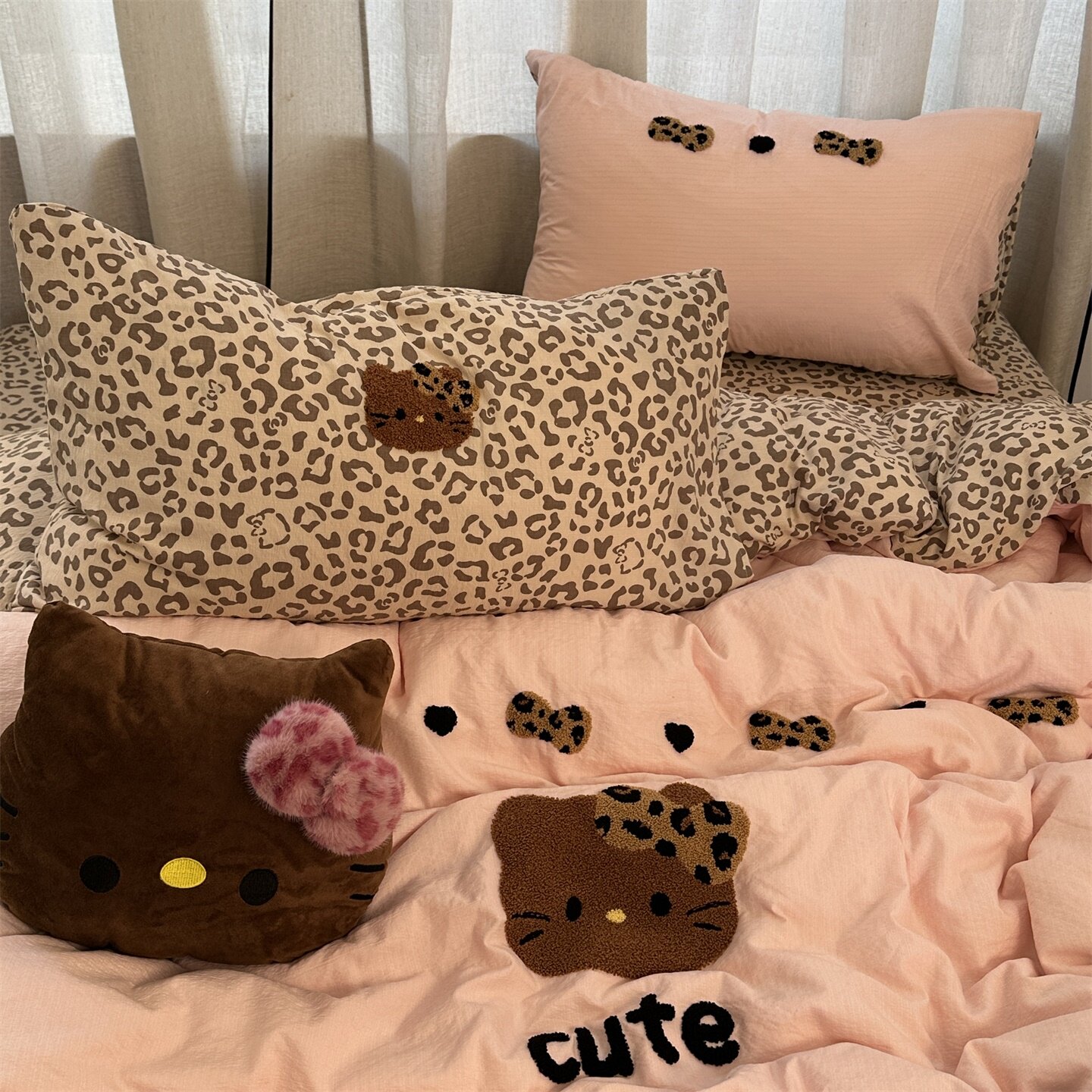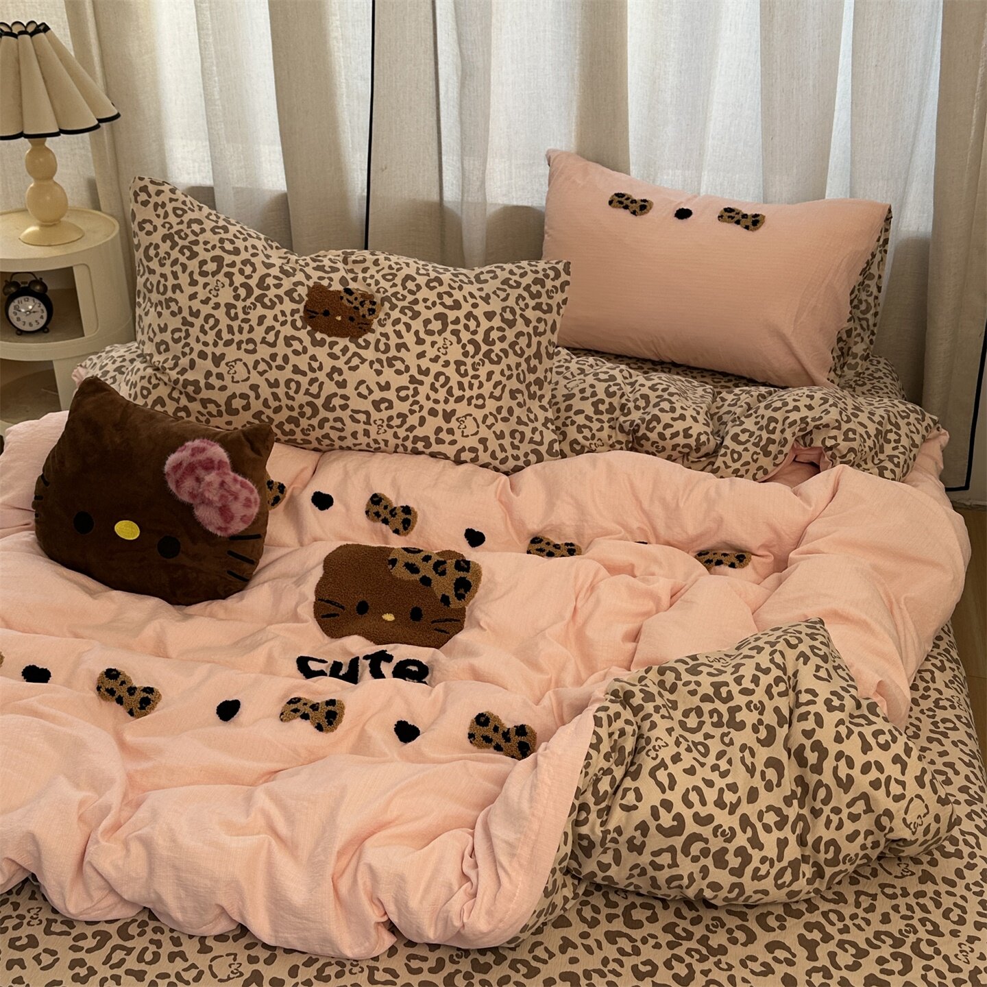 卡通豹纹kt毛巾绣四件套纯棉全棉双层纱被套被罩床单宿舍三件套4