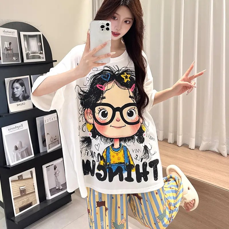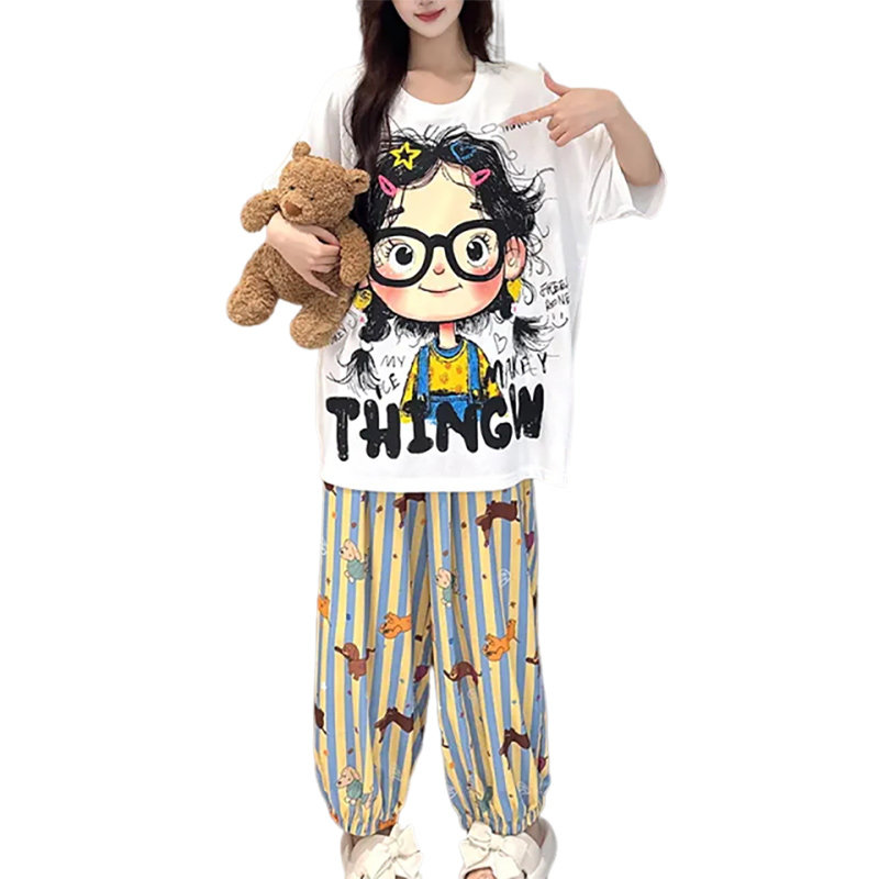 睡衣女短袖长裤2026新款带胸垫春夏卡通卷发女孩家居服套装可外穿