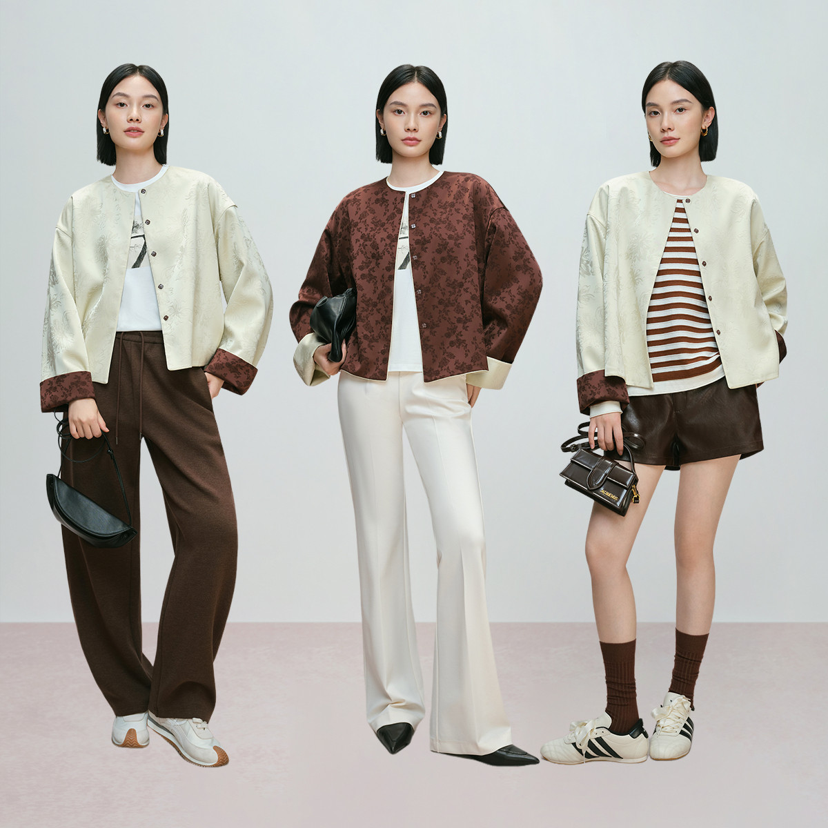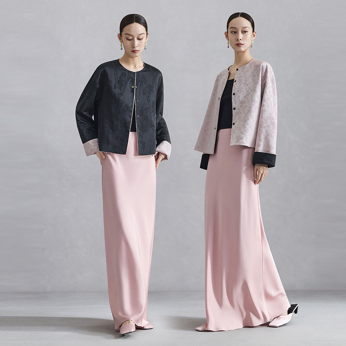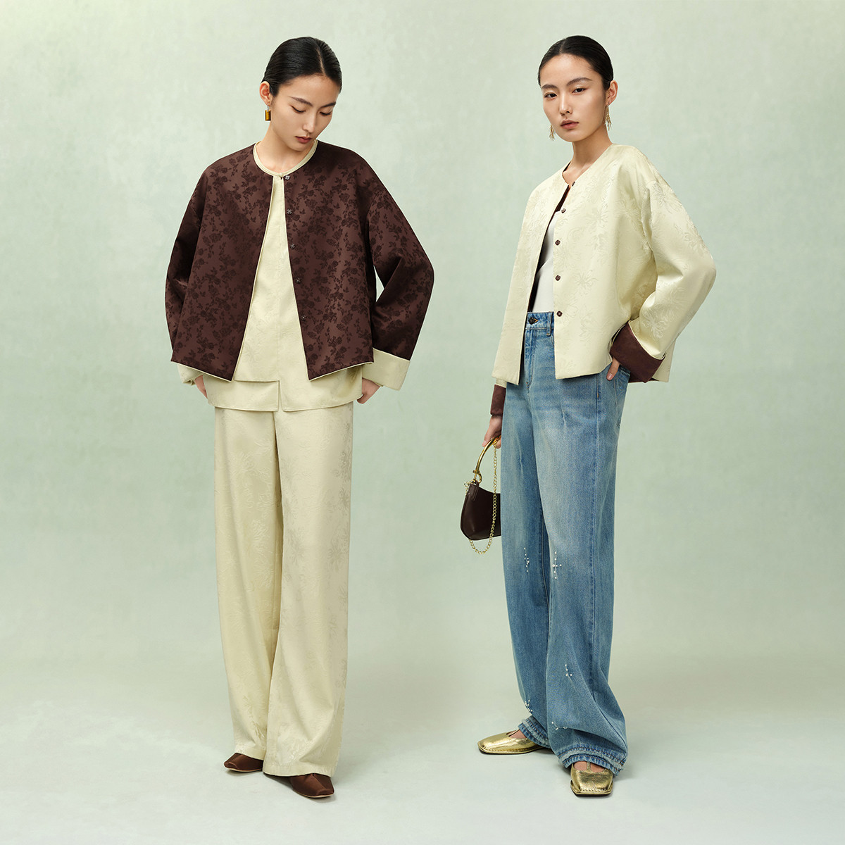 naivee纳薇2025秋新款新中式国风女装无领缎面提花外套女正反两穿