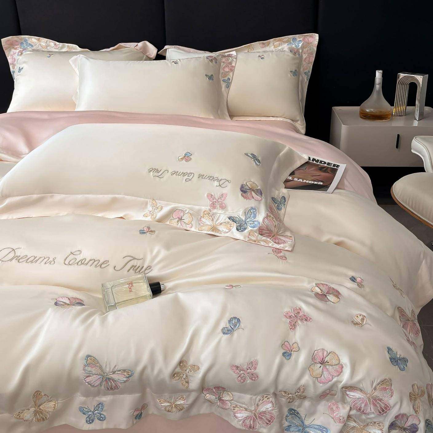 高档水洗天丝刺绣四件套夏季冰丝凉感轻奢被套床单裸睡床上套件