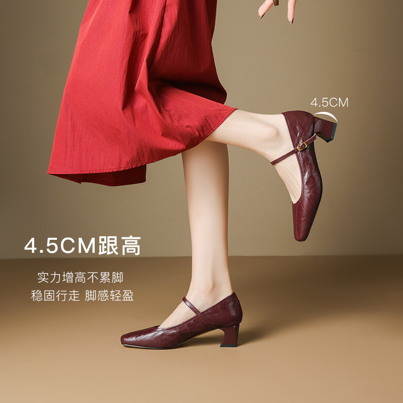 真皮~骄屿复古浅口高跟鞋山茶花一字扣粗跟单鞋尖头气质玛丽珍鞋