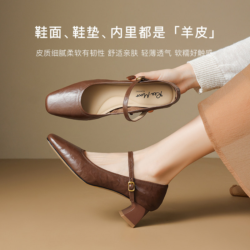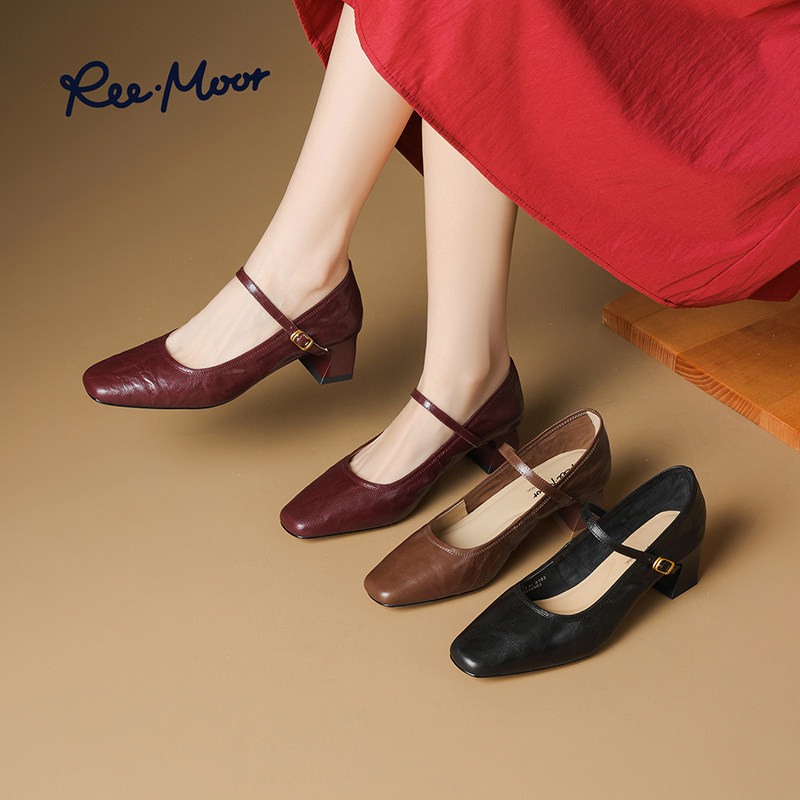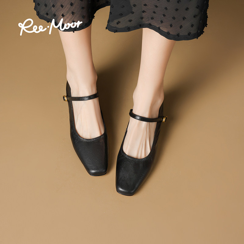 REEMOOR睿慕2025秋季新款法式方头粗跟浅口单鞋一字带玛丽珍女