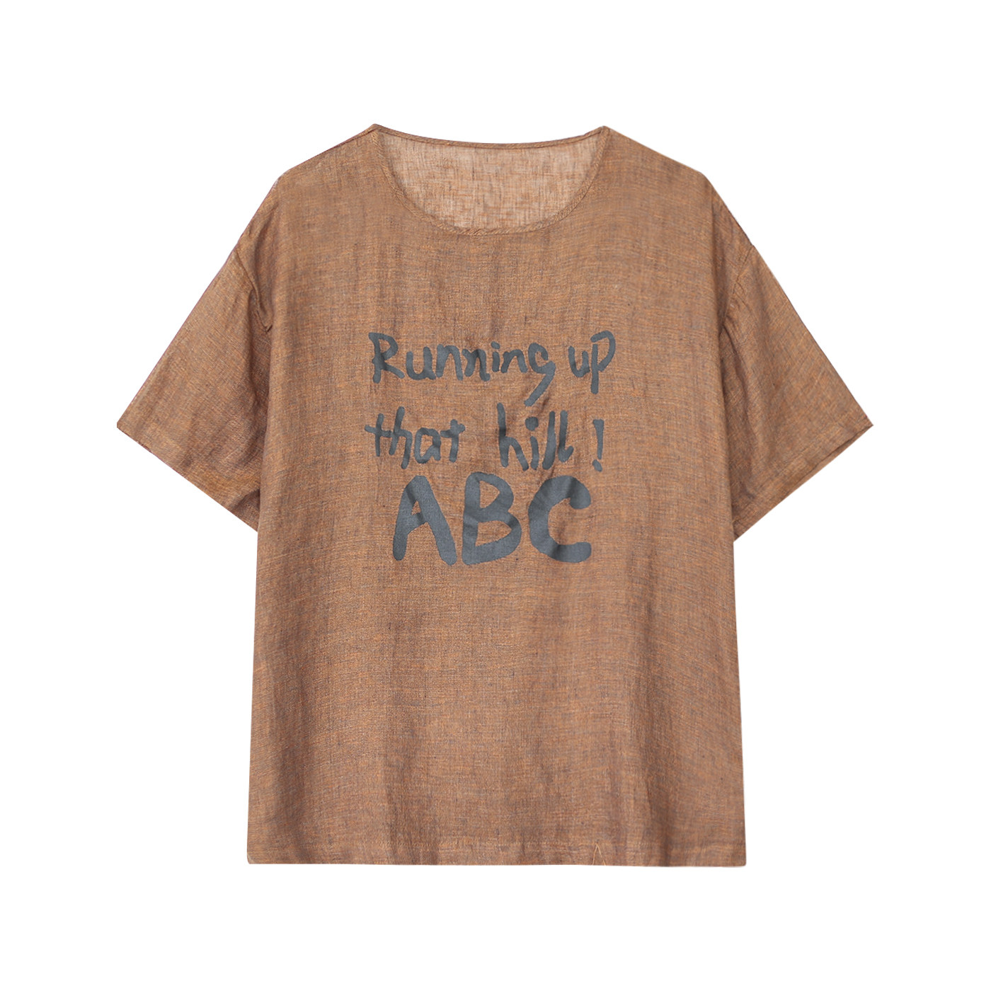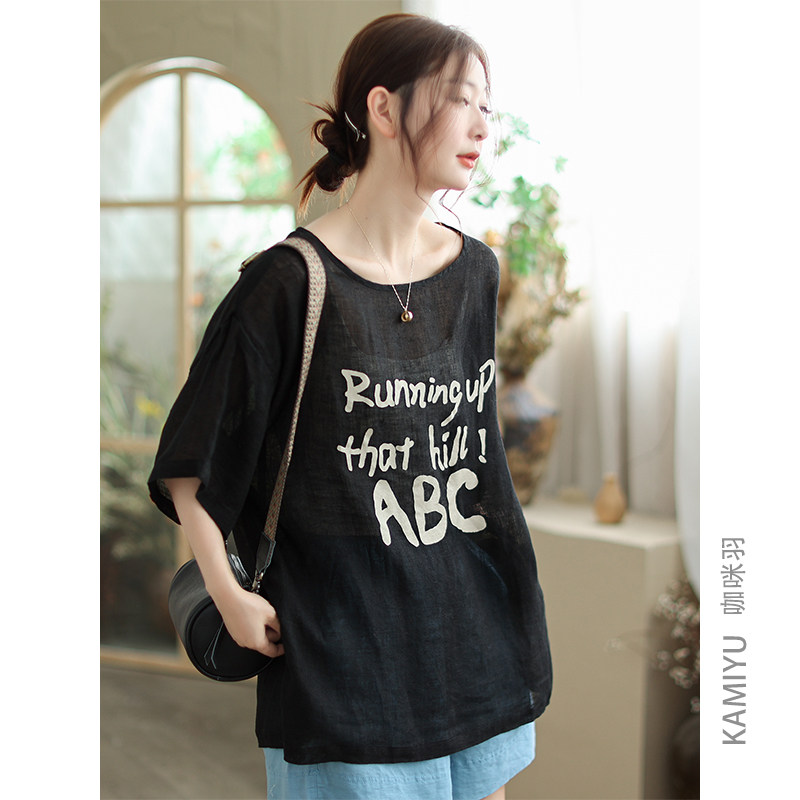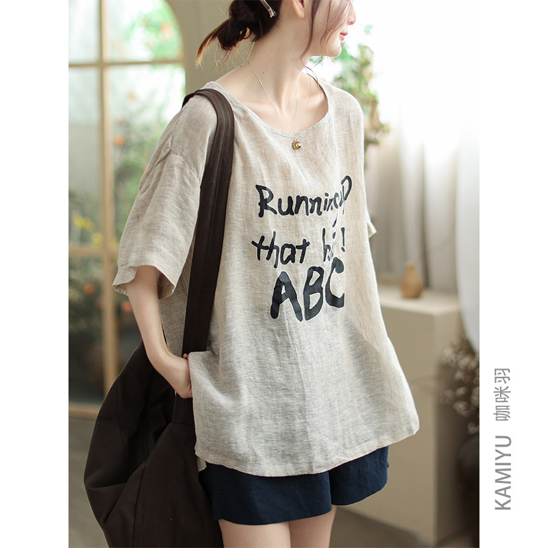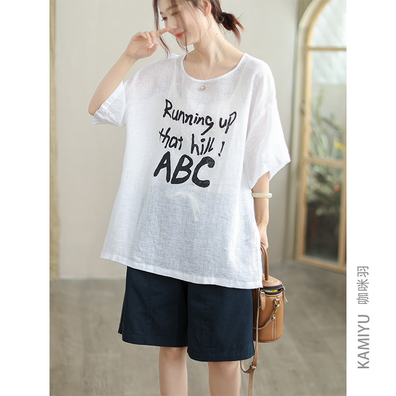 咖咪羽衬衫女夏季圆领文艺休闲印花亚麻女式宽松拼接女装上衣小衫