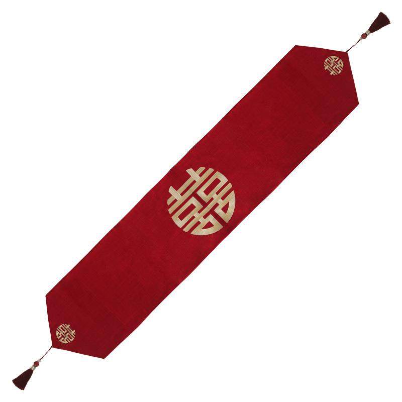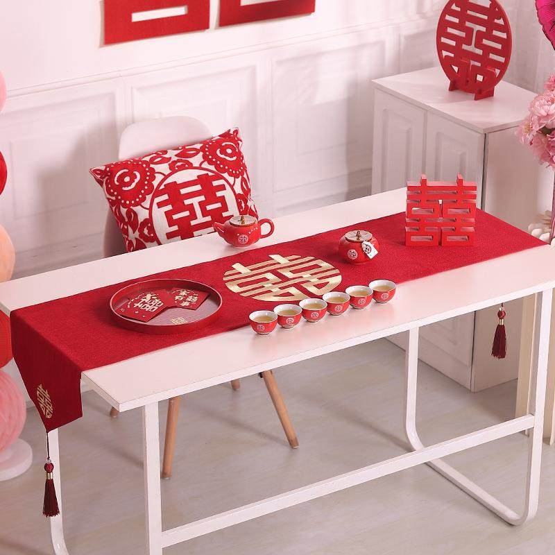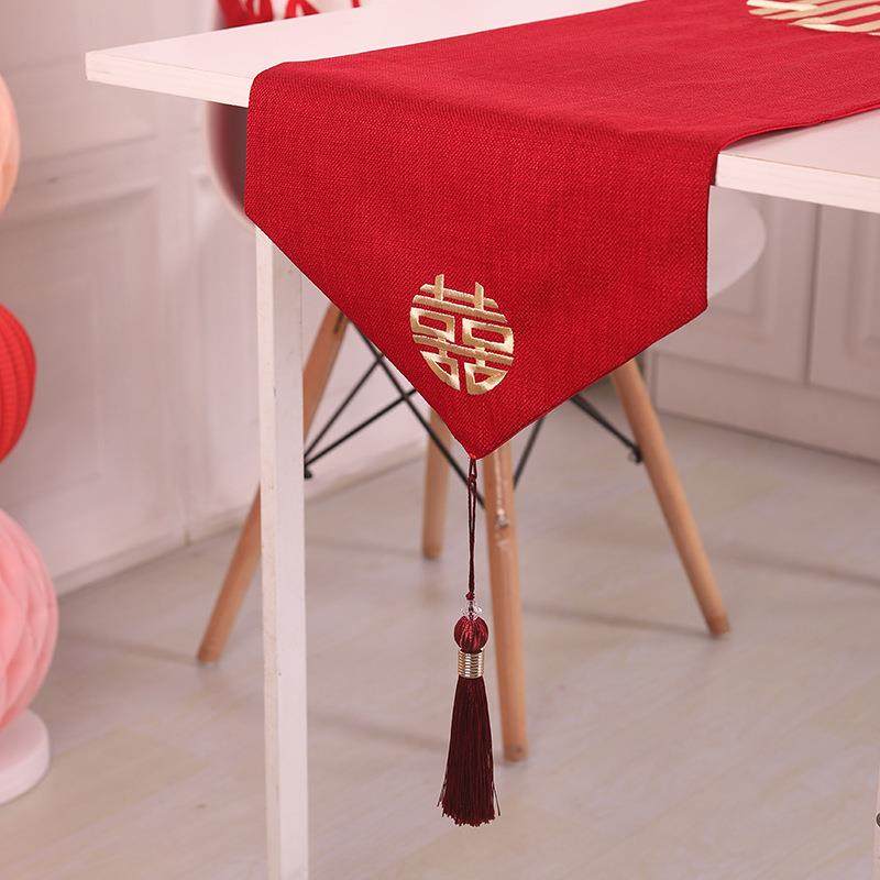 新中式复古结婚棉麻绣桌旗红色茶几桌布喜庆喜事餐桌布长条茶桌布
