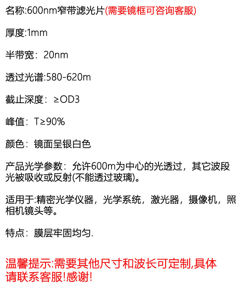 600nm窄带滤光片 红光通过带通高透滤光片其它光截止镀膜玻璃镜片