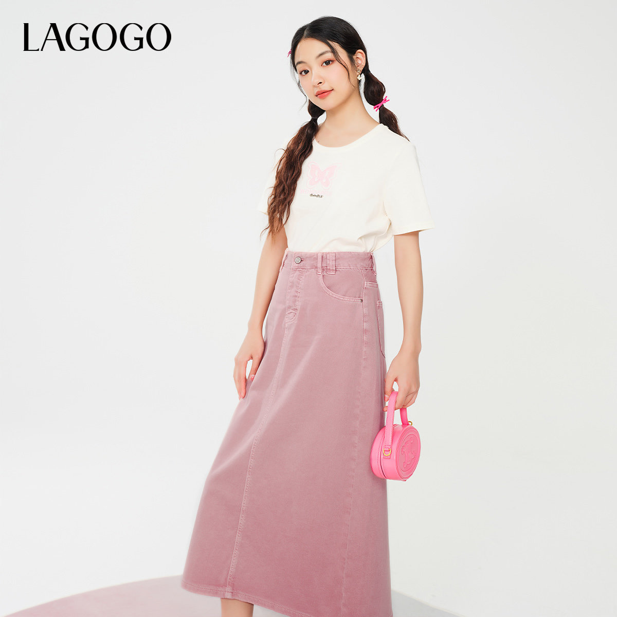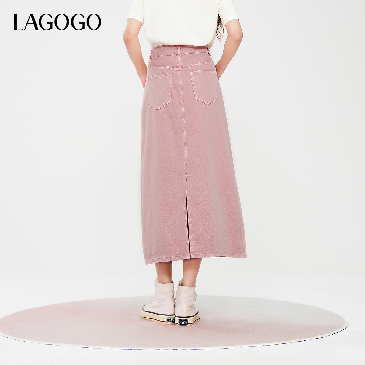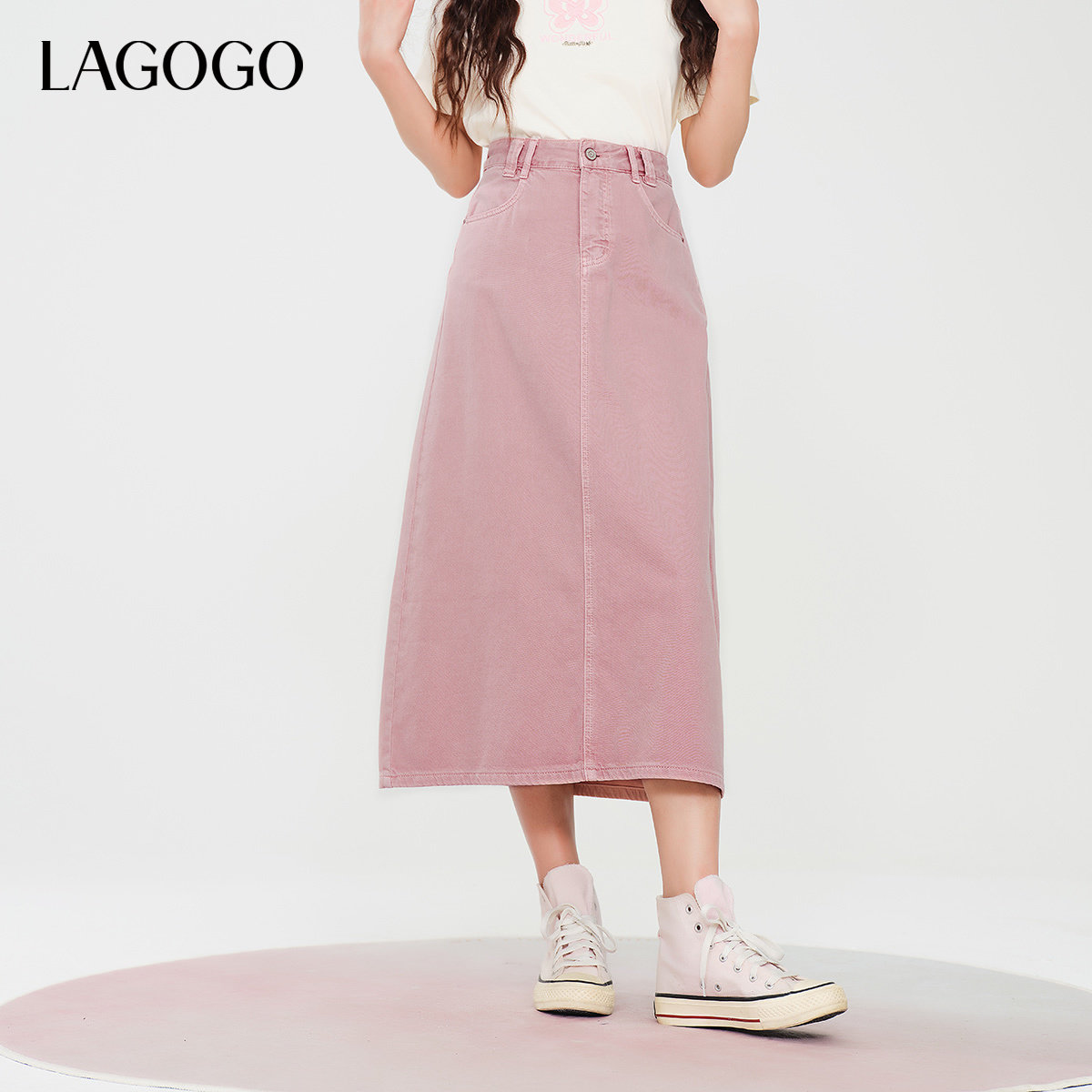 LAGOGO樱花粉纯棉舒适半身裙女拉谷谷春秋新款透气A字牛仔中长裙
