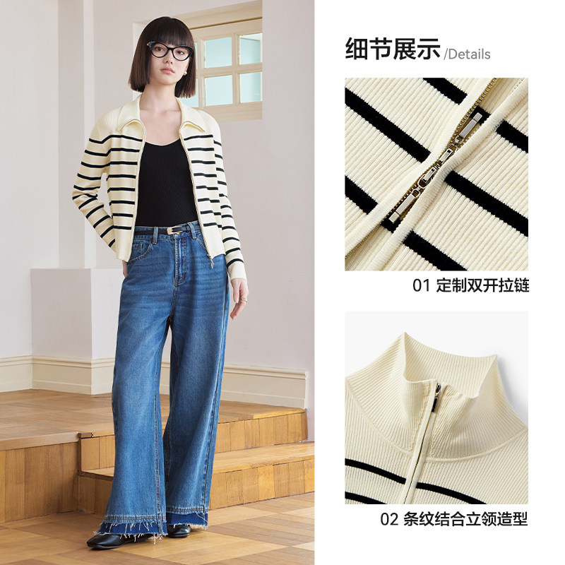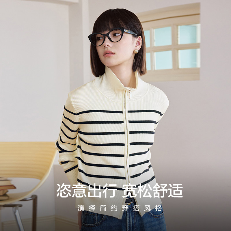 爱居兔时尚百搭条纹翻领针织开衫女2025年秋季新款休闲时尚短外套