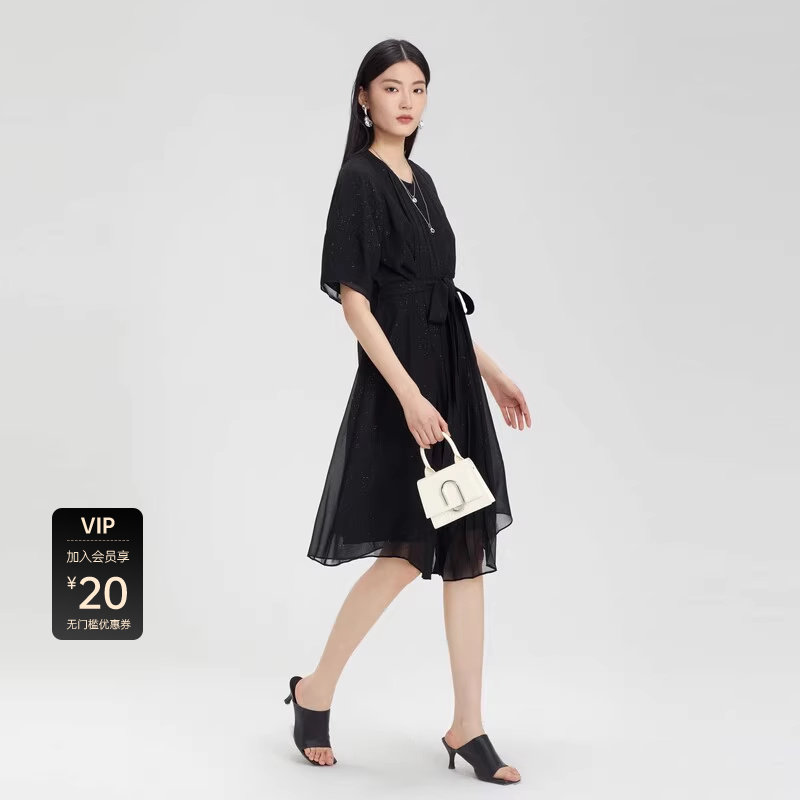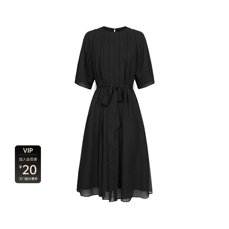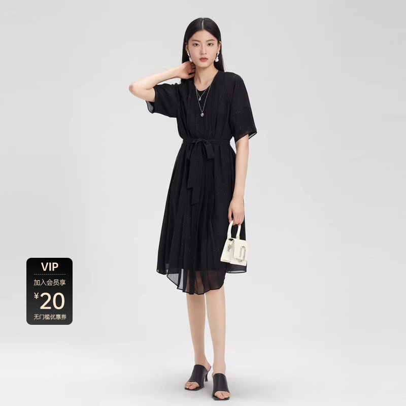 【热销补货】欧时力 褶皱短袖连衣裙女2026春新款收腰显瘦小黑裙