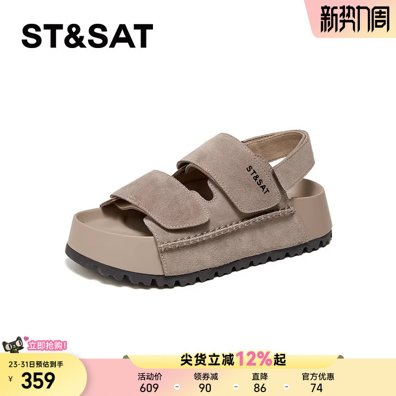 星期六厚底真皮罗马凉鞋女夏季新款英伦风魔术贴露趾外穿沙滩鞋女