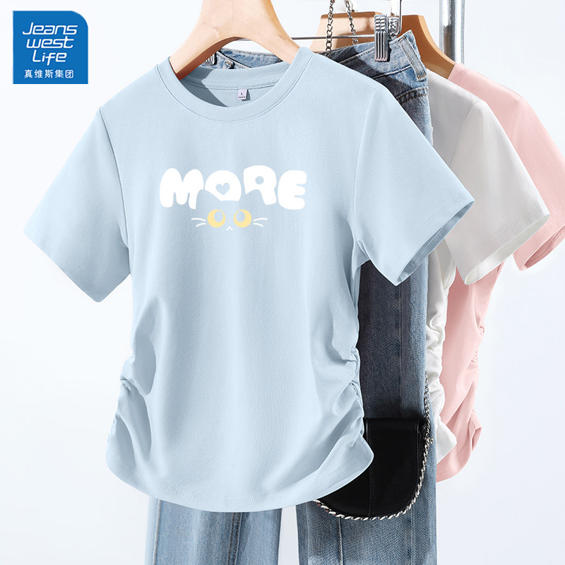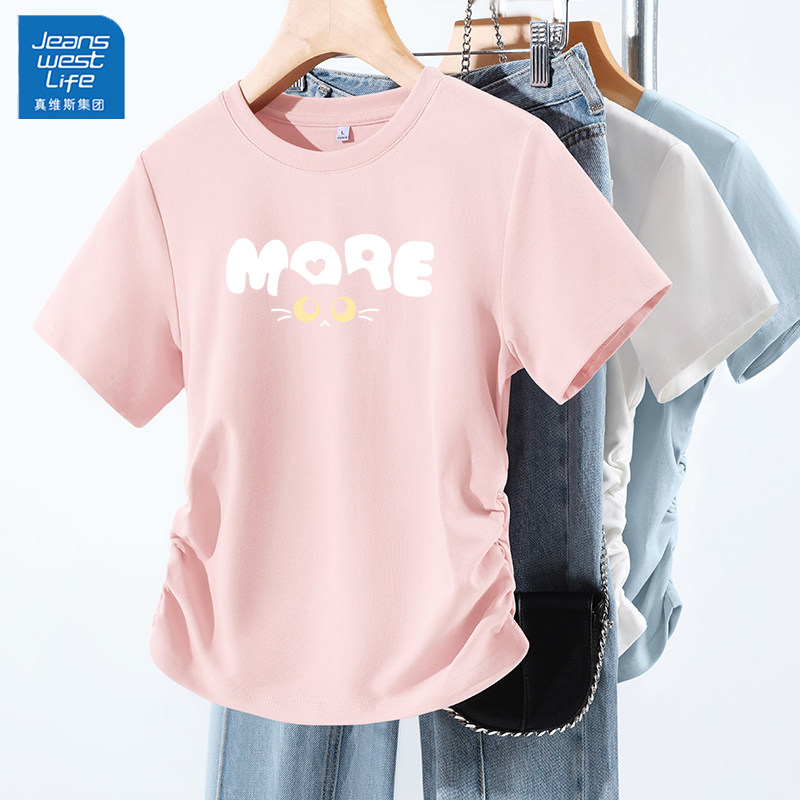 KHV真维斯黑色短款上衣正肩t恤女短袖2024新款印花修身显瘦半袖夏