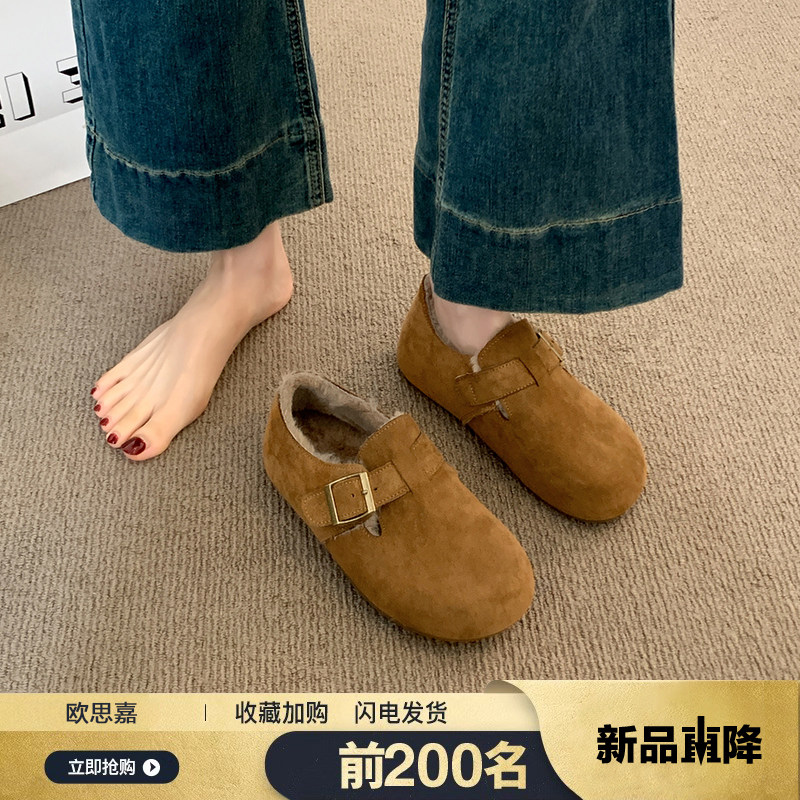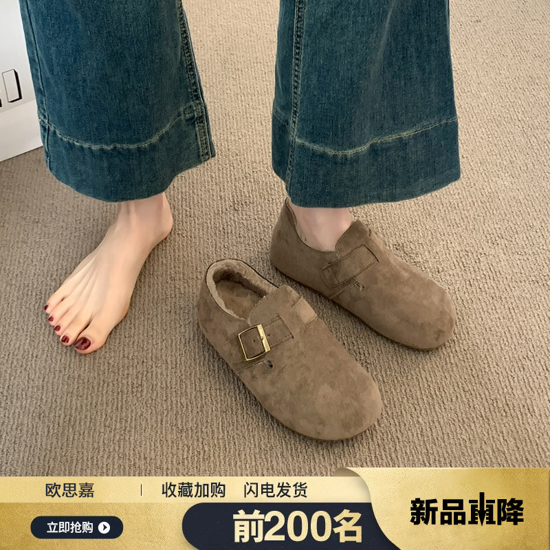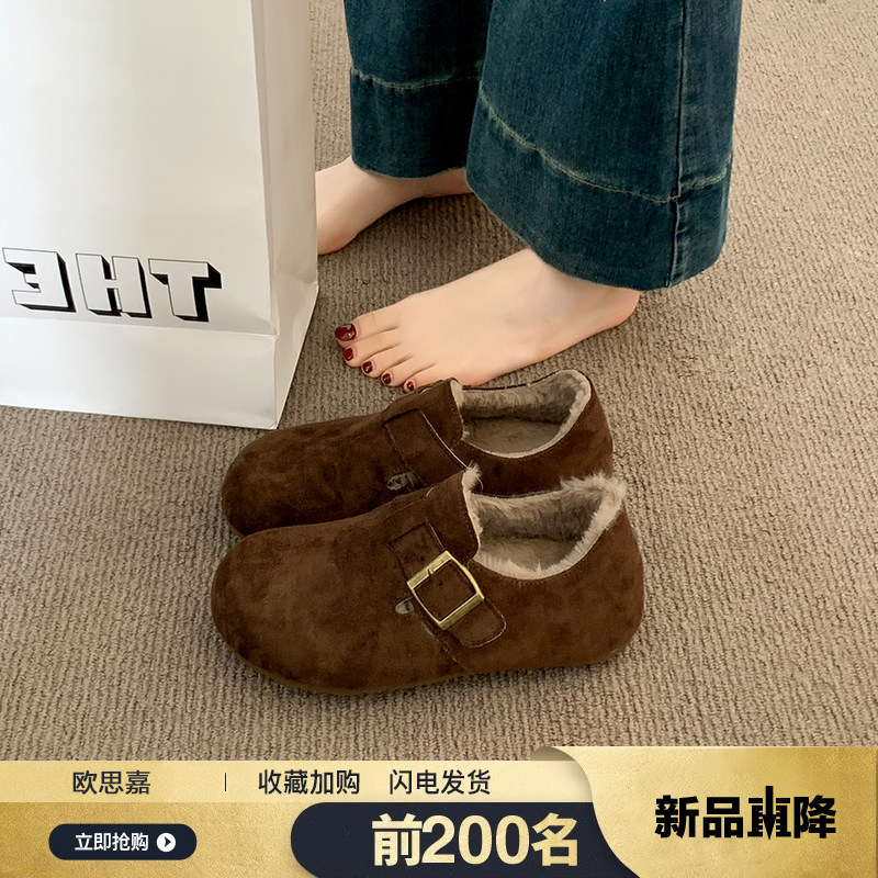 TATAFOCUS~加绒毛毛鞋韩版圆头皮带扣2025冬季新款勃肯鞋女35-28