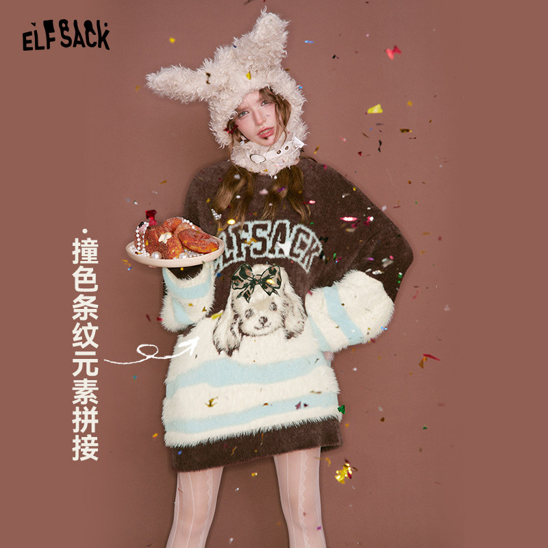 妖精的口袋毛绒绒小狗粉色撞色毛衣女2025冬新款甜美可爱新年穿搭