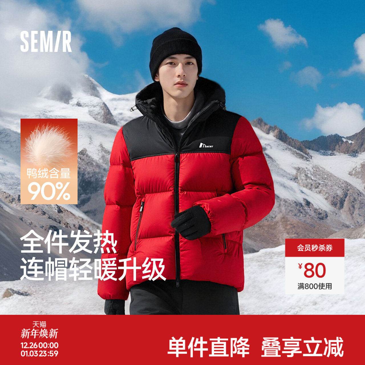 森马羽绒服男三防外套情侣冬装2025新款连帽上衣抗静电面包服保暖