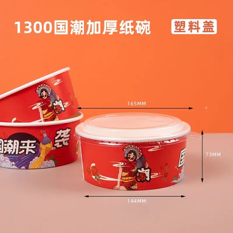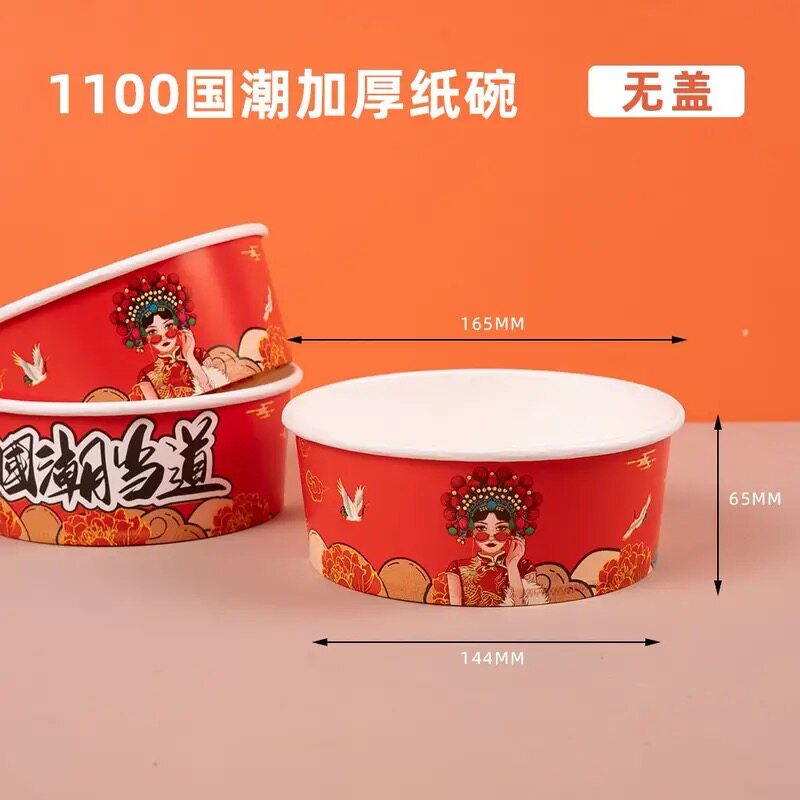 一次性纸碗圆形打包盒加厚外卖餐盒沙拉碗国潮带盖100只饭盒卫生