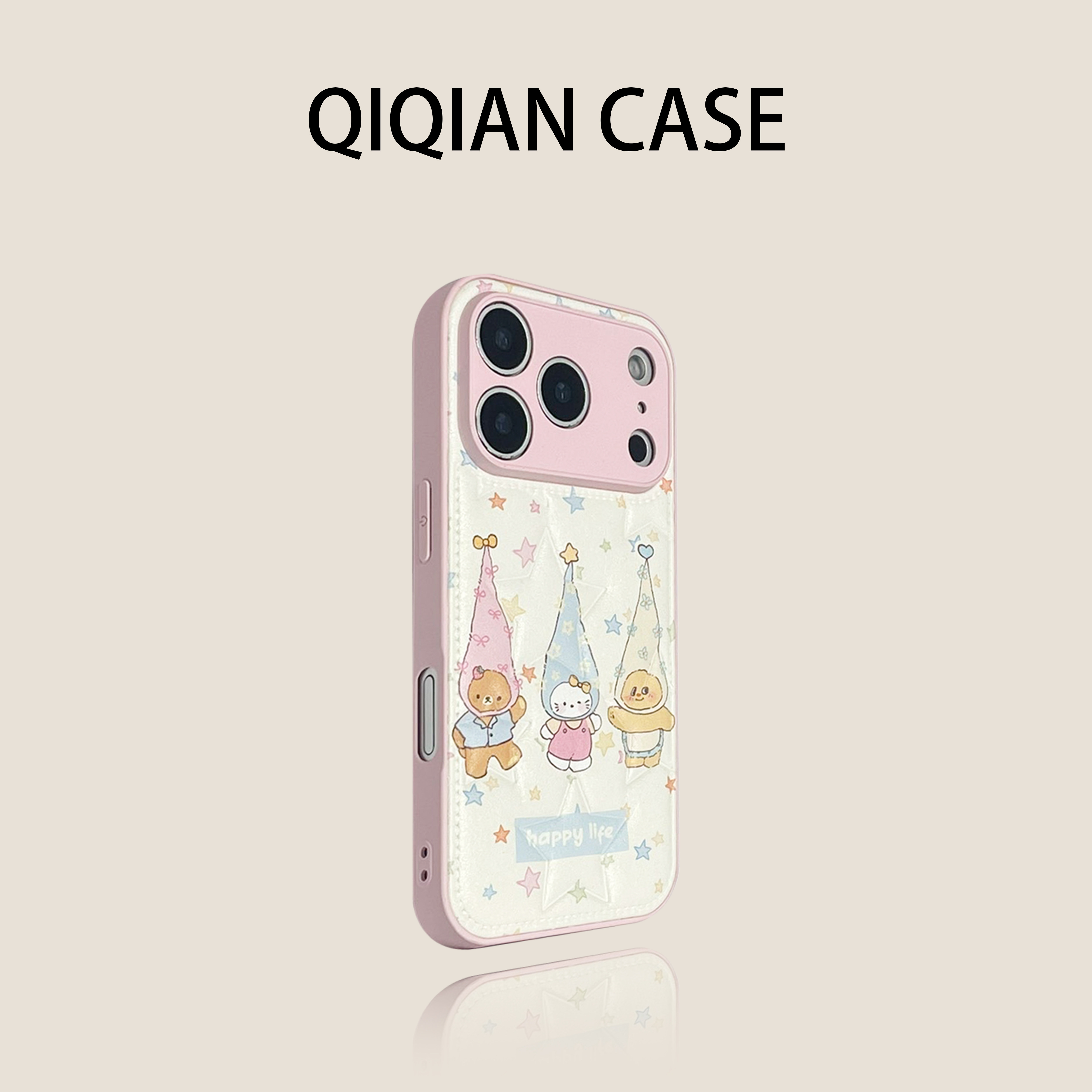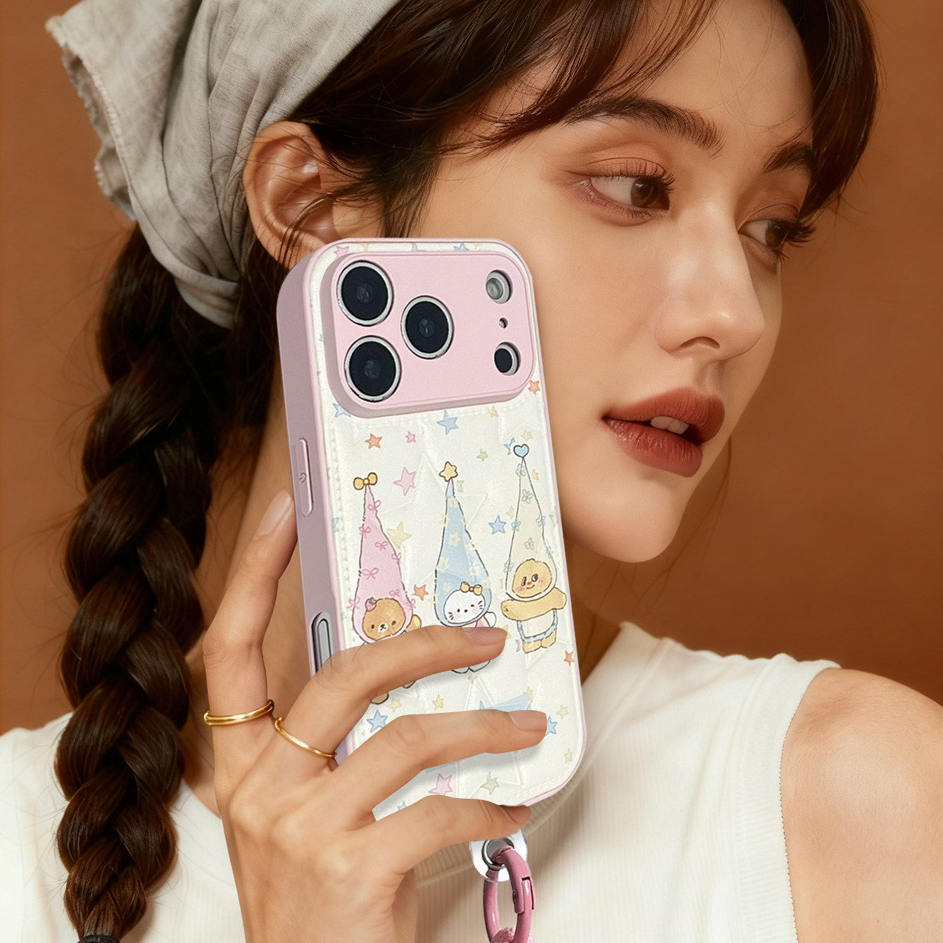 启乾 肤感直边五角星鼓包米白底三小只腕带iPhone17/16手机壳适用苹果15/14promax硬壳链条挂绳趣味可爱少女