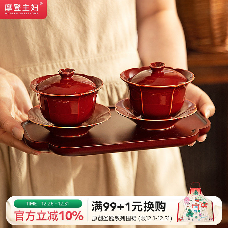 摩登主妇婚礼敬茶杯子结婚红色盖碗一对新婚陪嫁礼物新年茶具套装