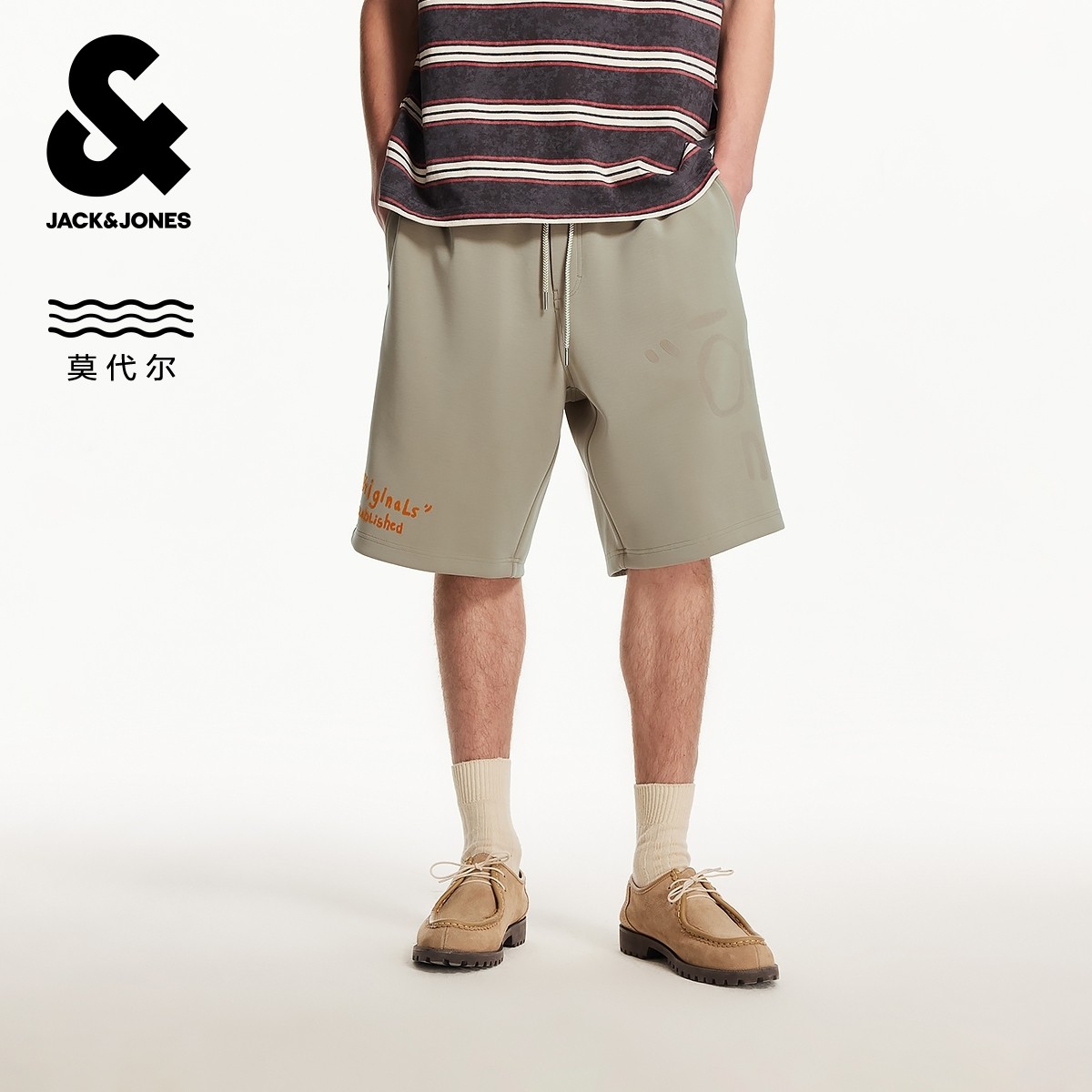 杰克琼斯奥特莱斯男装夏季新款潮时尚植绒胶印抽绳腰宽松短裤子