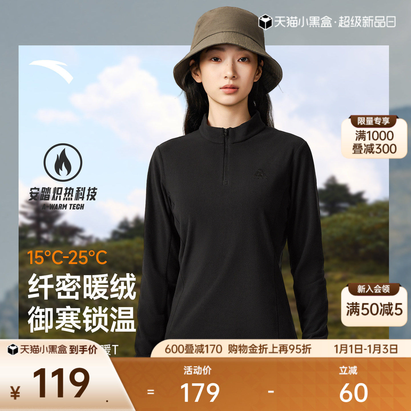 安踏半拉链长袖丨户外抓绒长T女冬季修身保暖打底衫内搭运动上衣